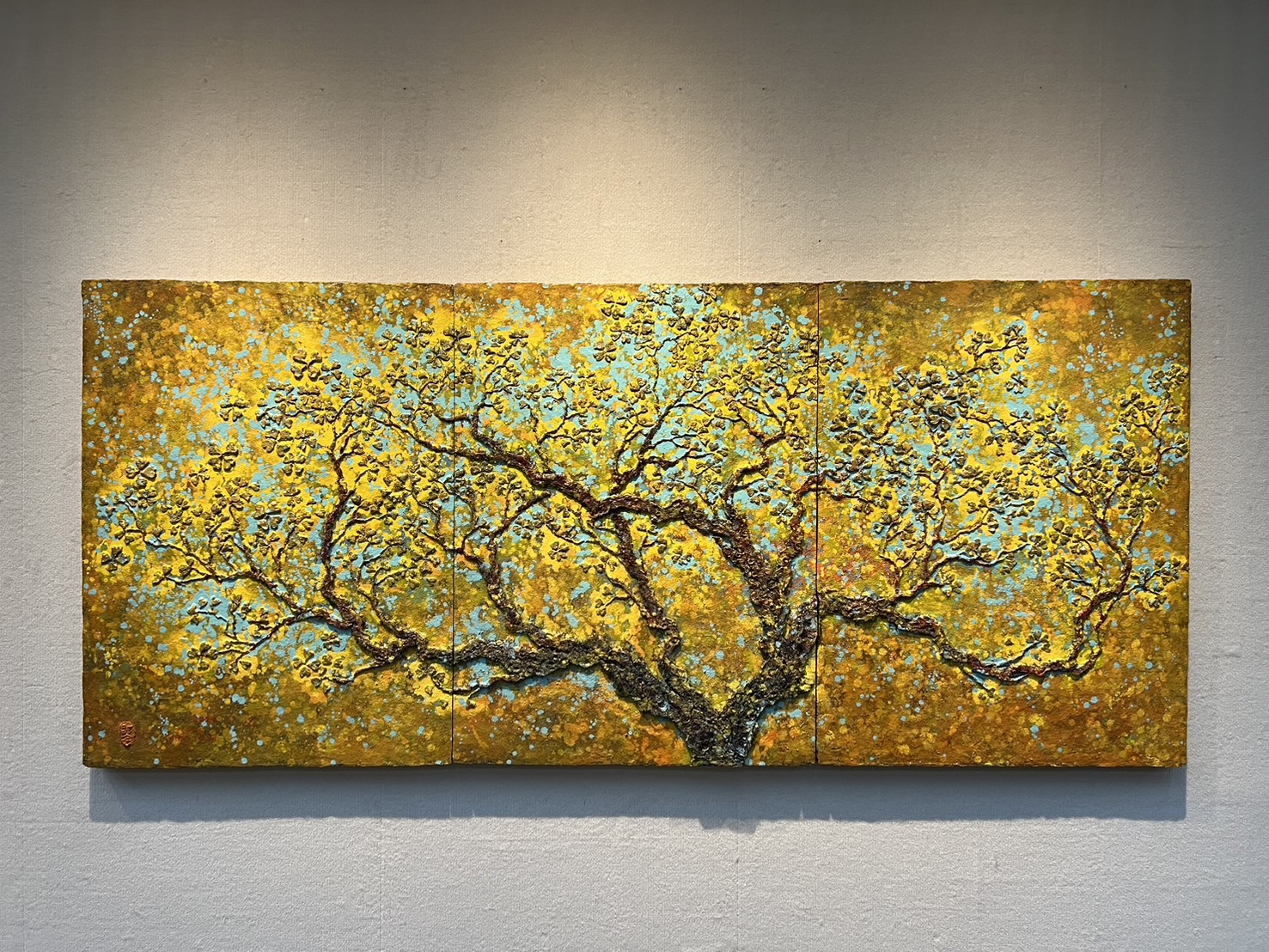 「生命之樹」系列作品中,有著花朵盛開的風華正茂,以燦爛的色彩展現生命力與喜悅;但同時,彎曲的樹型也象徵歷經挫折、磨難而造就的特殊姿態。蜿蜒起伏帶著英颯的味道,比直挺大樹更飽藏因生活酸甜所形成的厚實。就像人生歷程所淬鍊的底蘊,曾英棟將「愛」和「錢」的符號過渡到「能量」的主題,讓觀眾看到「生命之樹」正散發著來自「上蒼的光」!