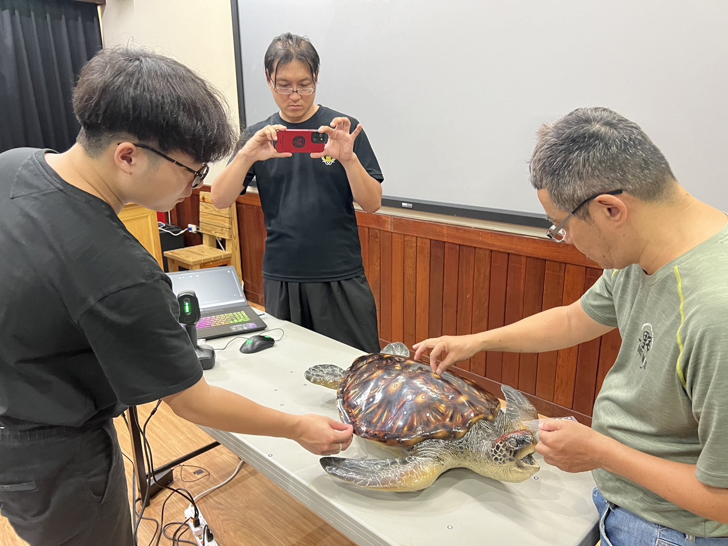 近日(9月21日),團隊前往大鵬灣琉球遊客中心,運用3D掃描技術對海龜標本進行詳細的逆向工程製作。此次掃描目的是精確記錄海龜的細節特徵,無論是龜甲紋理還是體型結構,都能夠以高仿真方式被數位保存,並成為未來生態教材中的核心部分。團隊的3D掃描技術不僅是精密記錄物種外觀,更是為後續大規模複製這些模型提供了可靠的數據支持。未來,這些數位化的模型將應用於各類教育展示場合,讓更多人能夠認識這些珍稀物種,進而提升大眾對海龜及其棲息環境的保護意識。