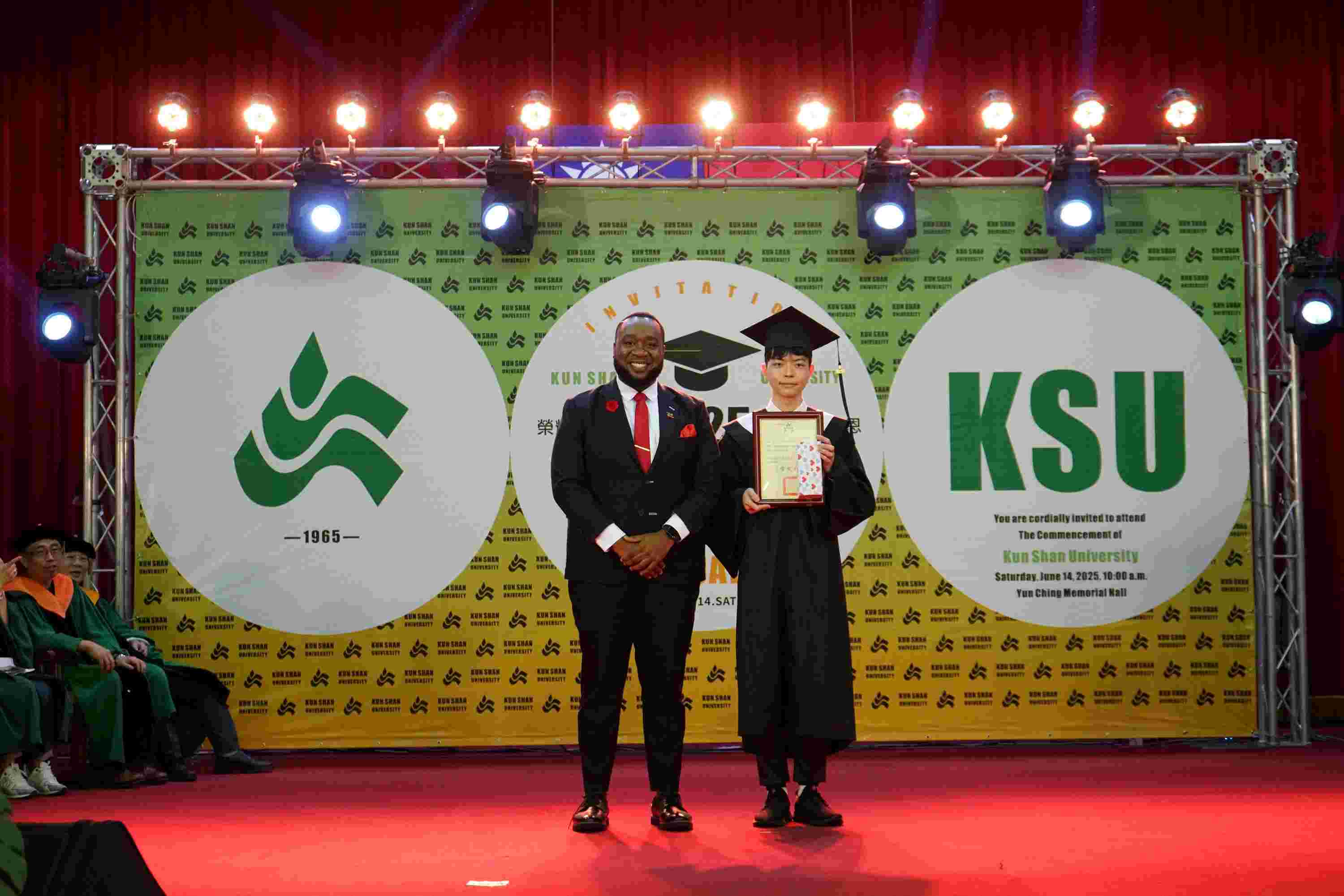 聖克里斯多福及尼維斯范東亞大使(H.E. Ambassador Donya Lynex Francis)也特別親臨典禮祝賀畢業生,他提到:「今天很高興看到我們國家有兩位學生從崑山科大畢業,該校提供豐富的資源與實作機會,讓學生能夠學習專業技能,並順利接軌職場,在座的每一位畢業生,未來即將展開人生新旅程,願你們都能擁抱挑戰,活出獨一無二的自己!」
