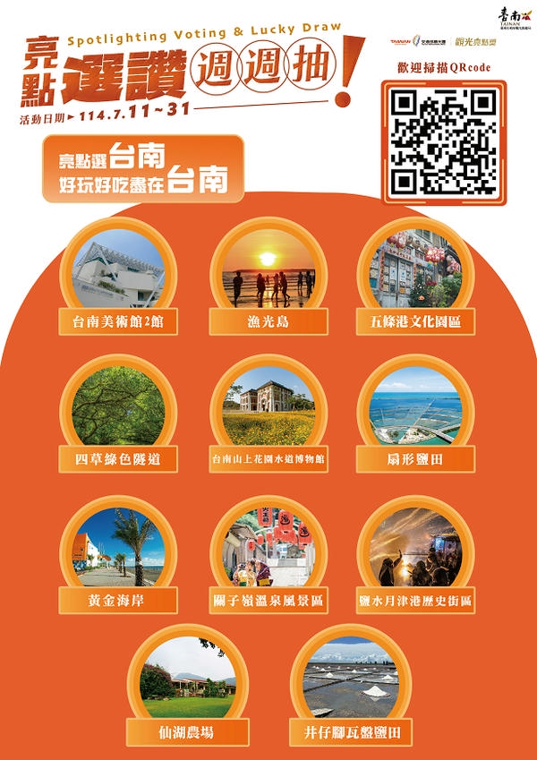 市府觀旅局林國華局長表示「市府提報9處景點為臺南市美術館2館、五條港文化園區、漁光島、關子嶺溫泉風景區、扇形鹽田、黃金海岸、月津港歷史街區、四草綠色隧道、 臺南山上花園水道博物館等9處,另有農業部提報的仙湖農場及雲嘉南濱海國家風景區管理處提報的井仔腳瓦盤鹽田,每天都很需要大家神聖的兩票,7/31前投票還可參加亮點選讚週週抽,總價值超過NT$30萬元的旅遊好禮週週抽!