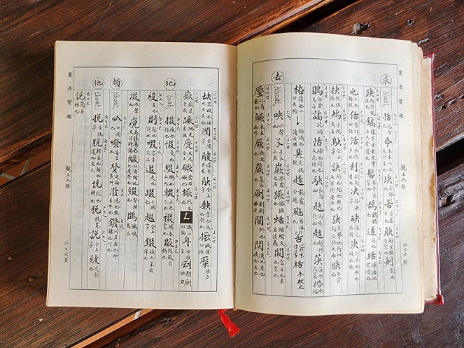▲ 林仙化創作四句聯,常參考臺語韻書「彙音寶鑑」找出適合的韻腳。(鄭佩雯拍攝)