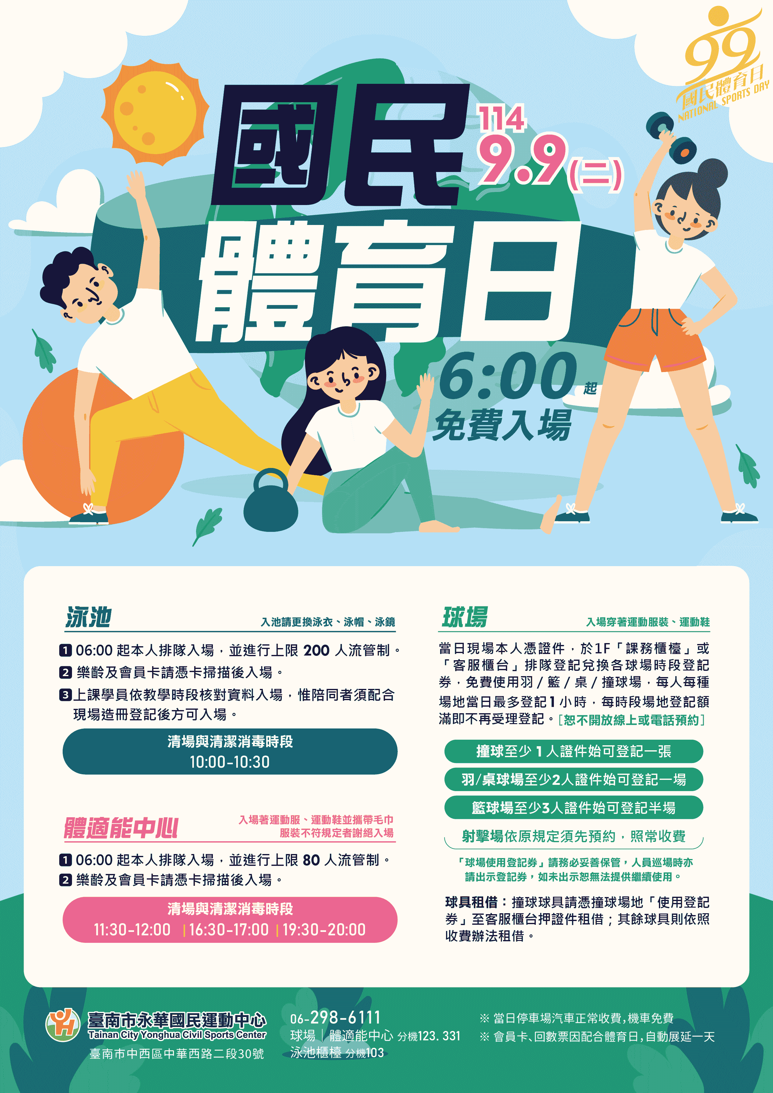 為了讓市民親身體驗運動的樂趣,9月9日當天,臺南市永華國民運動中心、歸仁區全民運動中心及市立游泳池等場館,祭出免費入場優惠;新市區全民運動中心則提前於9月7日推出相關優惠,希望吸引更多市民朋友走進運動場館,養成規律運動習慣。