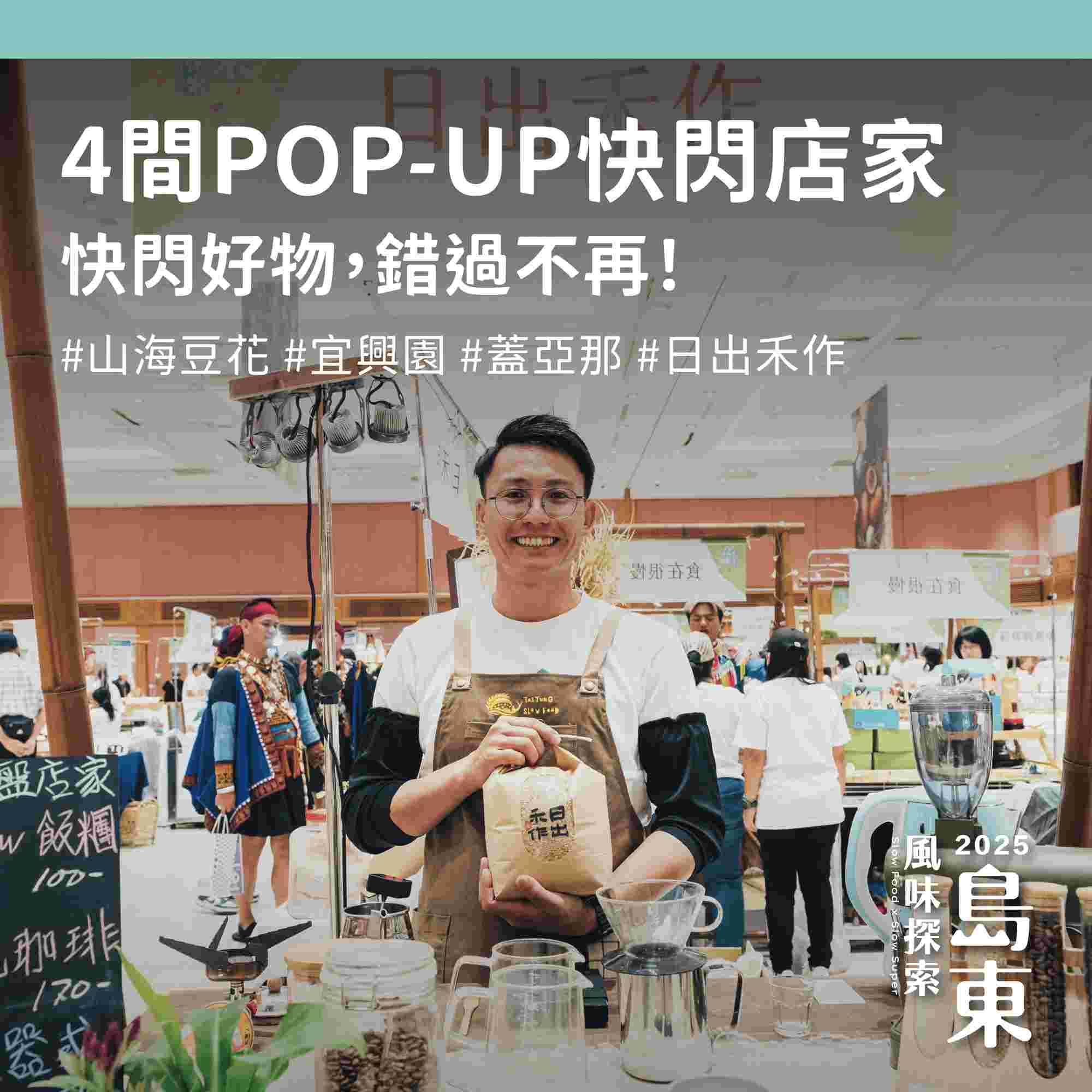 《島東風味探索》活動期間特別規劃每日限定的「POP-UP快閃店家」單元,連續四天由來自台東與各地的風味品牌輪番登場,為活動增添驚喜亮點。9/11(四)《日出禾作》堅持無農藥、無化肥的友善栽種方式,與台東電光地區的有機農友攜手實踐對土地的尊重,更推出全台第一杯零碳咖啡,展現其對永續生態的堅定承諾;9/12(五)《山海豆花》以台灣本產非基改黃豆結合日本鹽滷工法製成,堅持天然純粹、講究食材原味,從台東老宅小店一路走入五星級飯店,傳遞台灣的豆香記憶與在地風味;9/13(六)在地人氣品牌《宜興園》,由莊姐與呂大哥聯手打造的全手工綠豆椪廣受好評,從炸豬油、紅蔥酥到包餡與烘烤皆一手包辦,完美展現傳統職人精神,更被許多顧客稱為「全台灣最好吃的綠豆椪」;9/14(日)台東布農族品牌《蓋亞那》,帶來風靡各大市集的布農小米飯,搭配以小米酒釀慢火滷製的滷肉,香氣四溢、鹹香飽滿,讓人一口就愛上,現場更可親身感受布農族小米文化的魅力。四天四款限定快閃品牌,每日只此一家,邀請民眾把握難得機會,品味深具風土特色的手作美味。