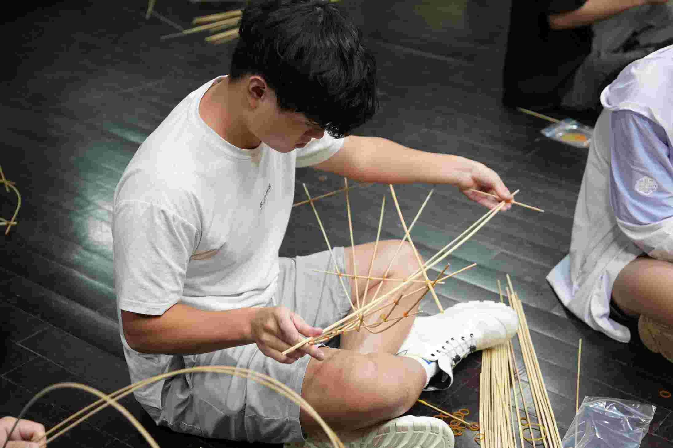 動手製作是本次工作坊的核心,也讓原本偏向靜態的講座氛圍,瞬間轉化為充滿活力的現場。創意往往需要「試試看」的經驗過程,同學們先分組進行創作,每位成員以自身動作與靈感出發,運用竹條為主要材料,並以皮筋連結,完成一件小型竹藝結構,再進行展示,分享作品與身體互動的關係。隨後組員間彼此討論,將各自的作品串聯、延展,逐步整合成一件大型裝置,最終成果是一座可步入的空間場域,不僅象徵痕跡、工法與記憶的交織,更呈現了從個體到集體的創作轉化,帶來沉浸式的體驗與反思。