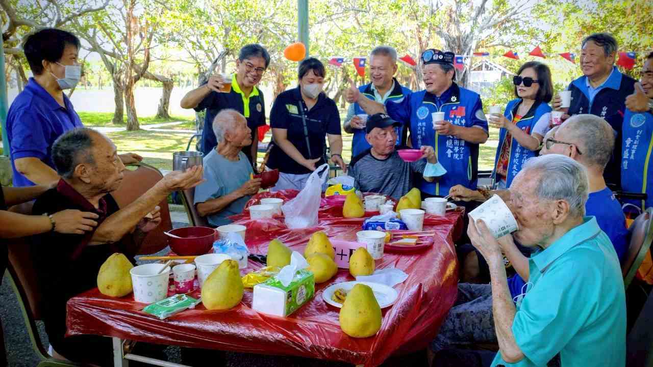校友總會共準備了各式各樣的串燒2,000串,七股烤蚵、帶葉玉米筍、起司絲瓜杏鮑菇、蔬菜寶盒、比臉大烤雞排、鹹豬肉、台灣豬香腸、美國牛肉串,陸軍校友健兒早準備就緒,提早一小時全力揮汗現場烤,香氣撲鼻,傳香千里,吸引大批住民聞香而來,現場更貼心的準備了容易吞咽的熱食,皮蛋瘦肉粥、開陽柴魚蒸蛋、入口即化蒸南瓜,排骨蘿蔔湯,ㄧ開場就ㄧ掃而空,伯伯阿姨們高興的合不攏嘴,熱烈的互動,長輩們用盡各種方式,有舉起串燒的、舉起雞翅串的、有雙手能拿起湯碗的、能比讚的、有站起來,肢體語言在在告訴我們,長輩們非常的高興,其中ㄧ位高齢95歲的譚老伯伯,主動要和我們認識拍照,他說:他是空軍士官長,待過東引金門,空軍通信電子學校畢業,是戰管聯隊退伍的,耳聰目明的長者,聽得眼睛不由得紅了起來,榮民的驕傲,我們關懷他,照顧他是必要的,快樂過中秋,相聚的時刻總是特別短暫,陳貴宗家主任還親自特別送行感謝,相約明年再相會。