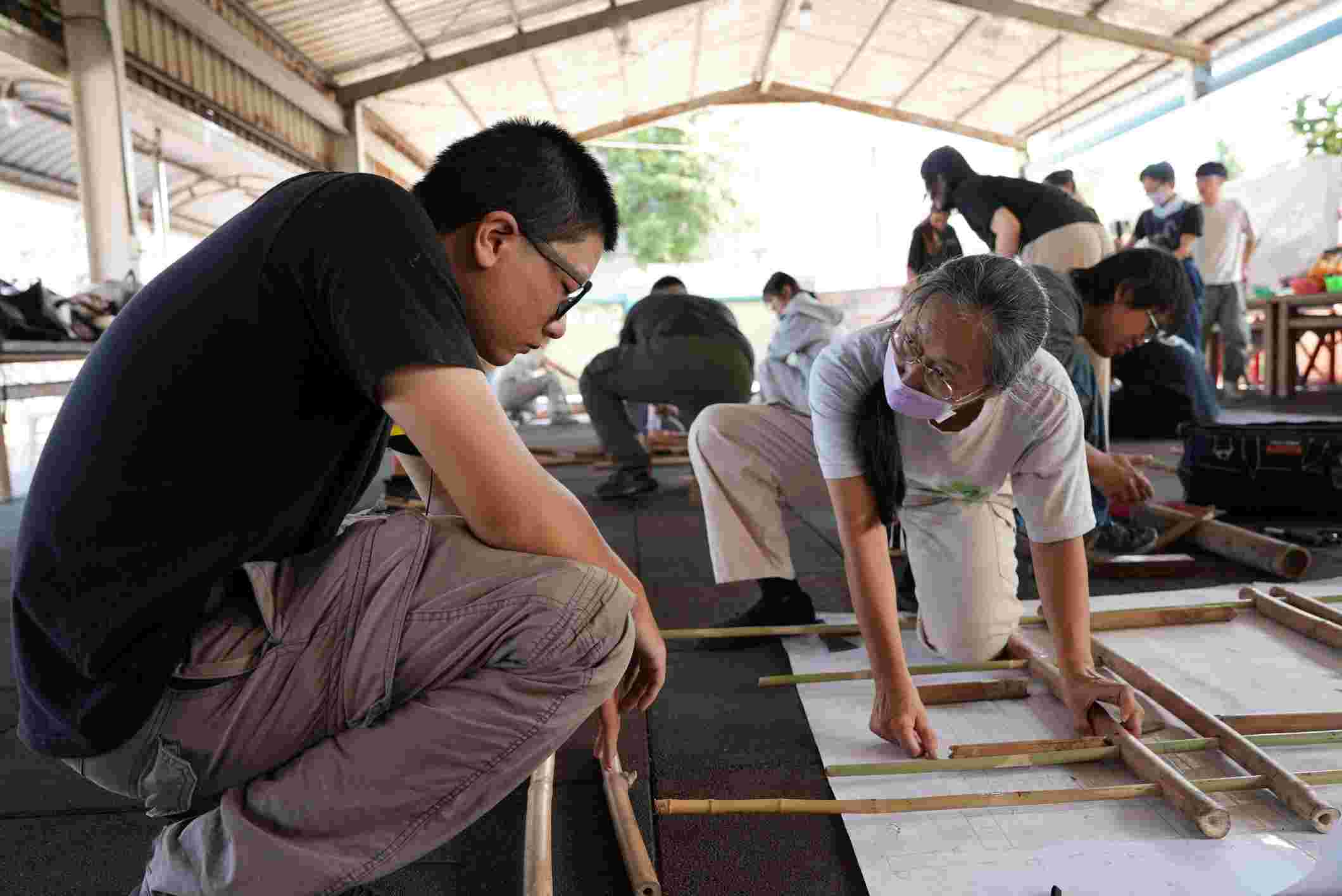 課程中,學員分組完成基座、屋體、屋頂等各階段建構,從竹材選料、支撐架構到屋頂收尾皆親手參與。過程中,南興國小黃寶東校長、興安宮黃登圍主委及黃水樹先生亦到場協助與指導,形成跨世代、跨專業的協作場景。透過群體合作,學員不僅理解結構力學與工法原理,更能感受竹材融合在地性與永續性的生態哲學。
