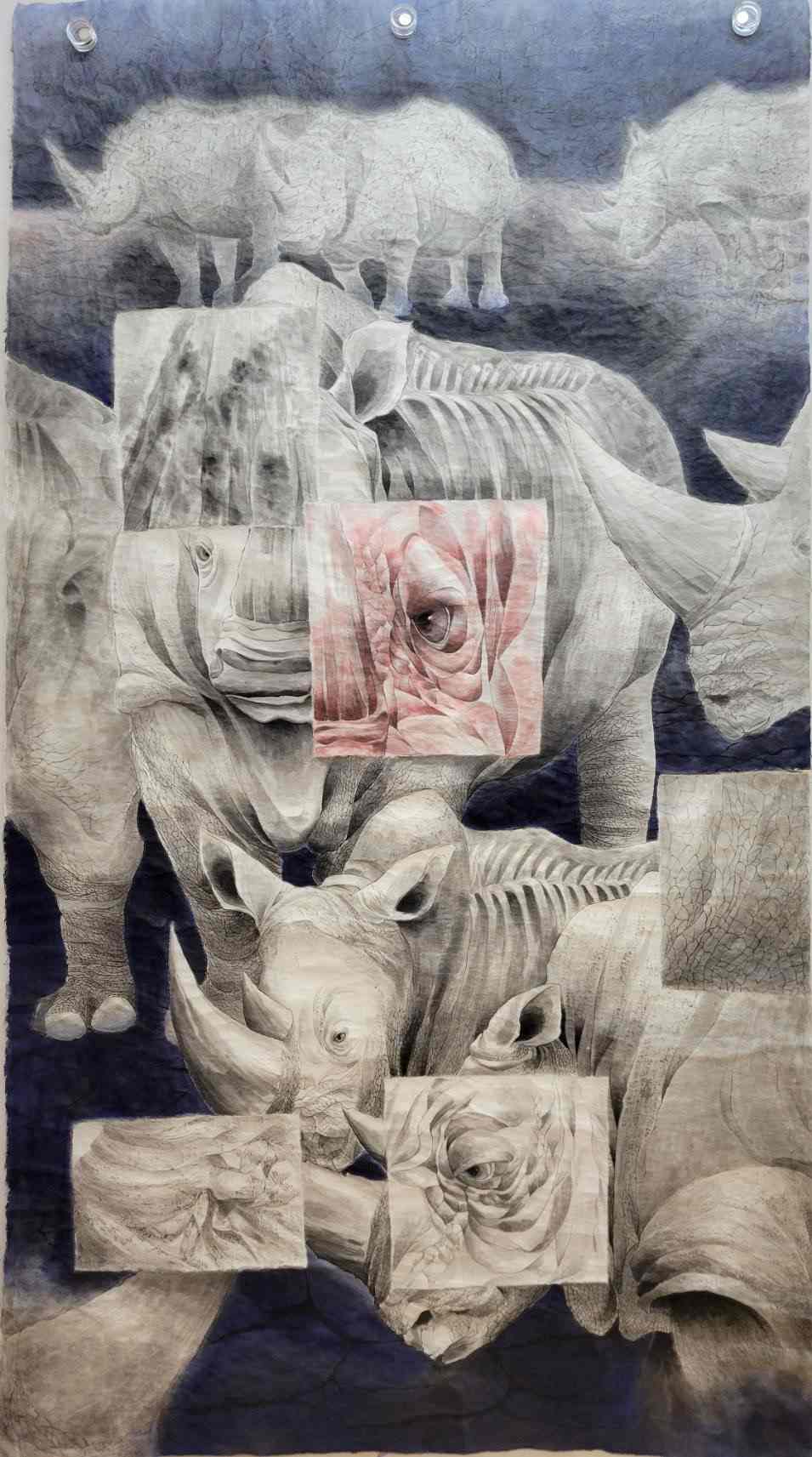 另一位榮獲水墨類大專組特優的王偲紜同學,其作品<被剝奪者>的創作發想來自於王同學觀看白犀牛的故事之後產生的感嘆。因為人類的貪婪而差點滅絕的犀牛遭到盜獵者持槍射擊,本屬於牠們身體一部分的角被硬生生割下⋯⋯,諸如此類的畫面令我印象深刻。於是在畫中以分割畫面特寫角和眼睛,中央的紅暗示著血腥及失去,而畫面整體用墨藍色凸顯犀牛的白,加上隱約可見的骨骼,讓牠們看起來宛如發著微光的灰白幽靈,在畫面中增添無盡的哀傷和寂寥。