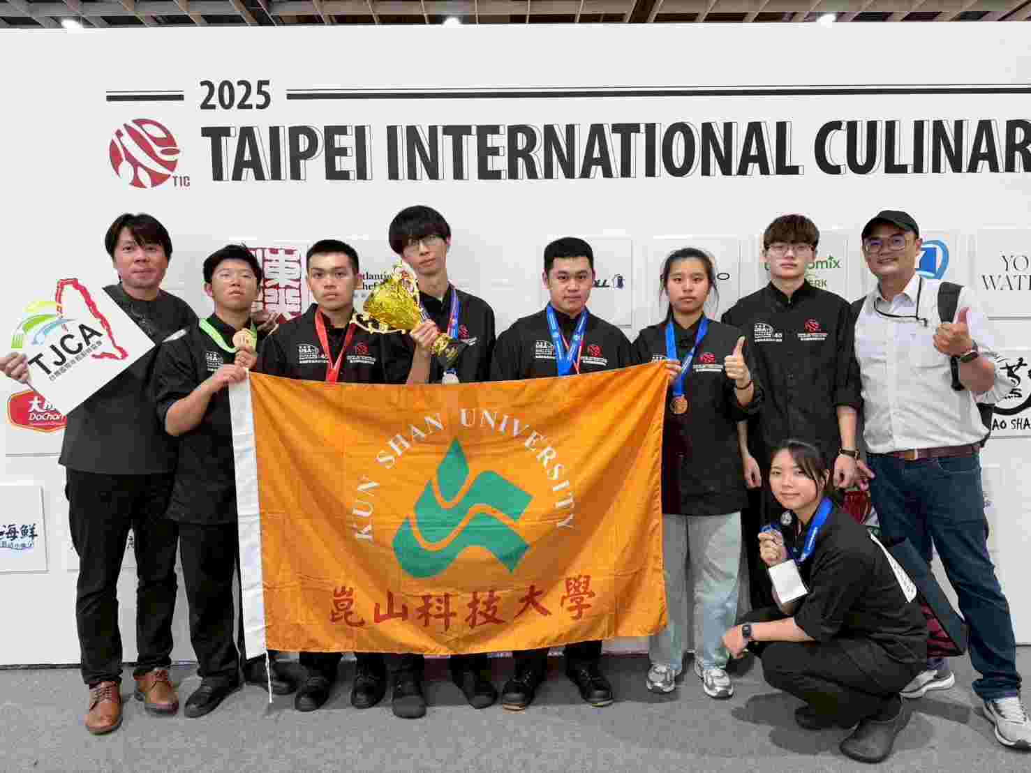 崑山科技大學餐飲管理及廚藝系師生於11月14日至17日的「2025 台北國際廚藝挑戰賽」中表現亮眼,與來自國內外眾多專業廚藝選手展開激烈競爭,以沉穩且成熟的烹飪技術脫穎而出,團隊最終榮獲10 面獎牌,包含金牌2面、銀牌4面、銅牌4面,展現餐飲系多元化與扎實的專業訓練成果。