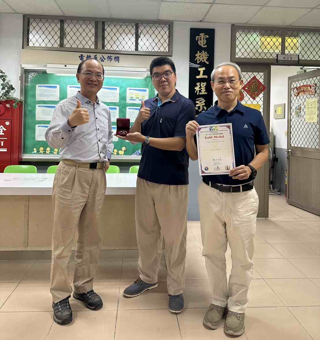 教務長兼電動車暨智慧電子工程系謝明君教授、機械系翟大鈞助理教授共同發明「全日型低溫太陽熱能智慧發電系統」,其以熱電晶片作為太陽熱電發電元件,黑色鋁板作為太陽熱能集熱器。在集熱板背面,熱電晶片其熱端以列陣排列方式安裝於集熱板上,其冷端安裝水冷散熱器,確保冷熱兩端有較大的溫差,以提升發電效率,當熱電晶片兩端有溫差時即產生電能,獲得金牌實至名歸。此外,謝明君教授所指導的另一項作品「太陽能加熱儲熱裝置」則獲銀牌。