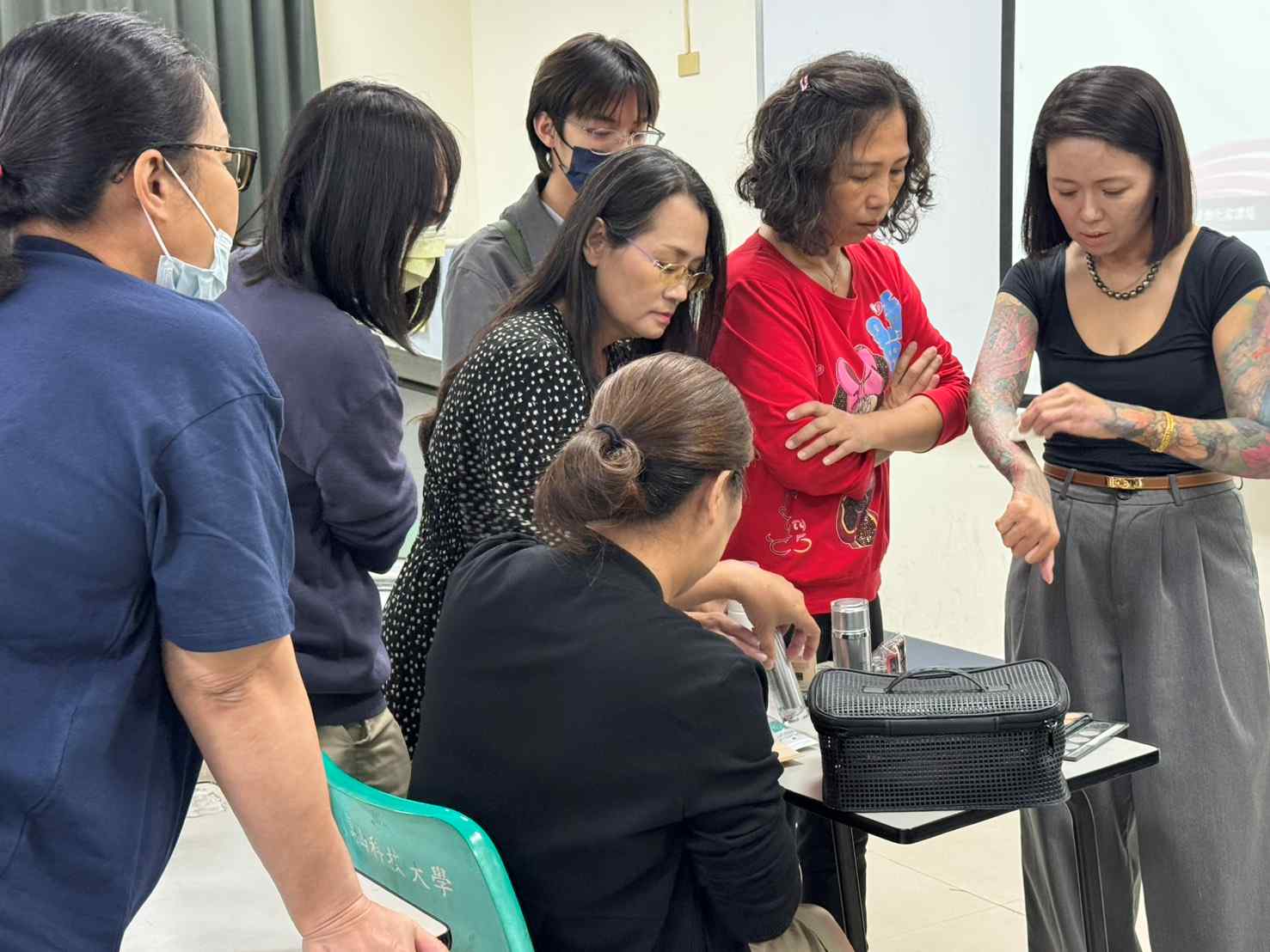 陳萳西老師10年前曾經歷嚴重燒燙傷,後在陽光基金會的陪伴下走過自卑與封閉,重新走入人群並學習化妝,除了考取乙級美容師證照,更進一步回饋社會,成為臉部平權代言人與志工團團長,持續為傷者服務,展現令人敬佩的正向能量。她以刺青將手臂網狀疤痕轉化為獨特的藝術,並在課堂上讓同學近距離觸摸「被火紋身」的雙臂,甚至進行修飾化妝的實作操作,讓大家在指尖的觸感中更理解修飾化妝的不易與背後的生命重量。不少同學表示,這是第一次真正理解到,原來化妝也能化為陪伴與支持,甚至成為讓一個人重新站起來的力量。