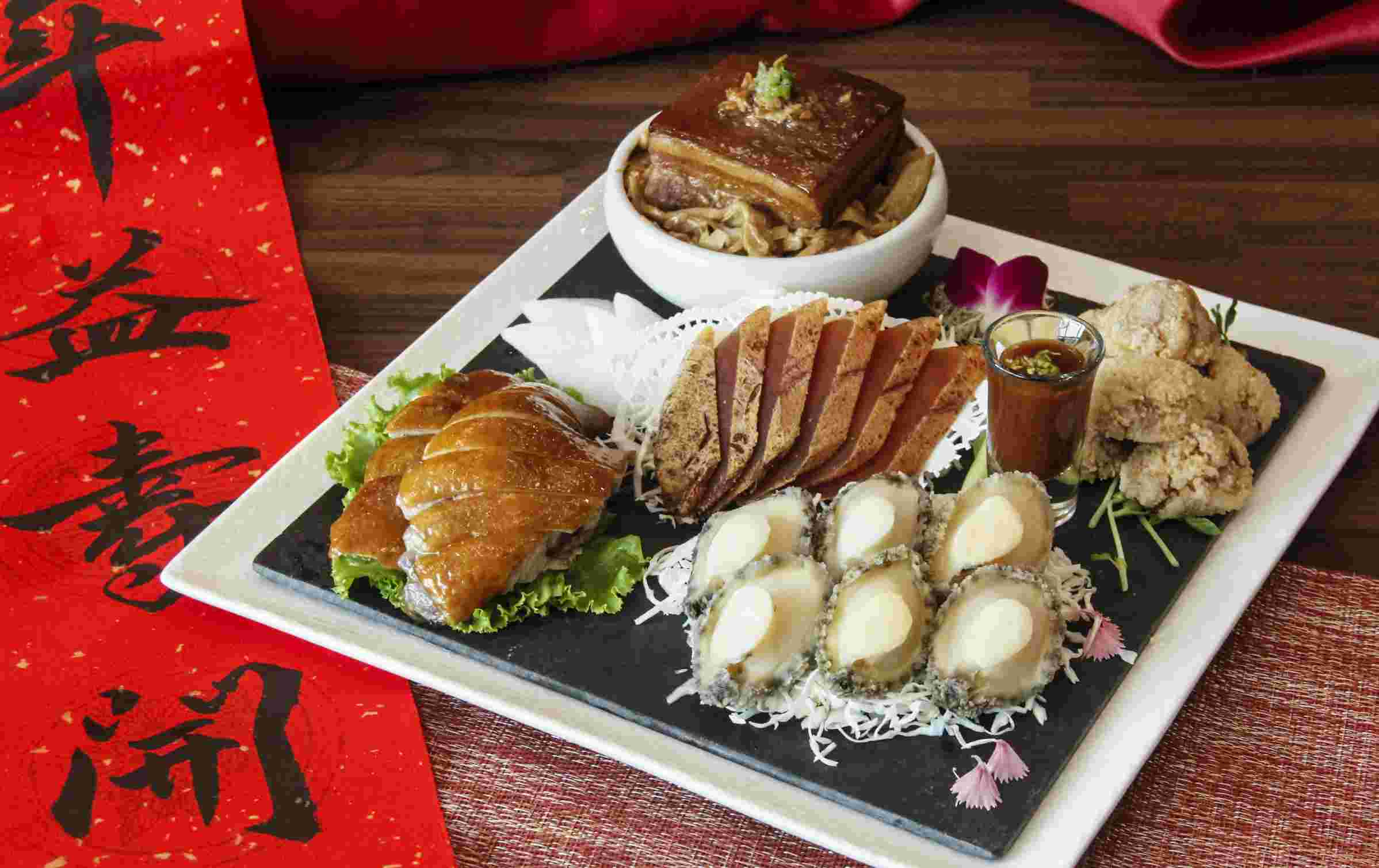 「和風海大蝦米糕」肉質爽口的海大蝦,搭配主廚特製和風醬,甜鹹綿密的米糕,令人垂涎欲滴。「古早味南靖雞」是超過300年的傳統台菜,經過醃、炸、滷、泡、燴、蒸等程序,繁複、費時,遵循台菜精神再現辦桌菜風華。「花菇蔬蠔皇鮮鮑」上選飽滿帶殼鮑魚,以秘製醬汁醃製,金華火腿、老母雞、赤肉熬煮高湯入味加入大花菇,口感鮮美有嚼勁。「潮式佛跳牆」特選老母雞及多種山珍海味,以肉骨高湯、紹興酒與各種頂級佐料密封於罈,透過細火慢燉熬成。揭開罈罐瞬間,濃郁湯頭香氣四溢!