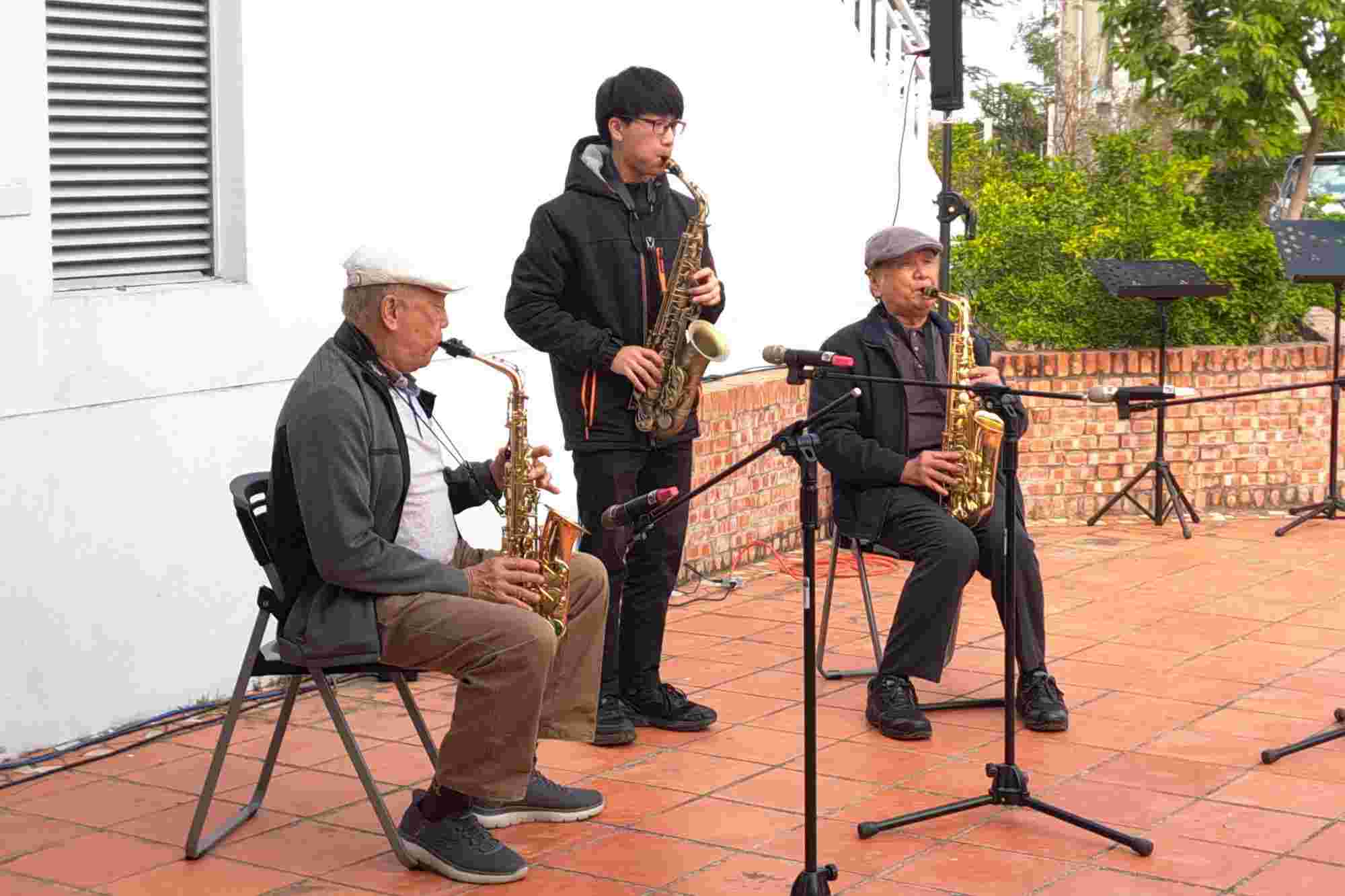 音樂展演內容皆為課程學員歷經多次練習後的學習成果。長笛班以〈月亮代表我的心〉、〈I Can’t Help Falling in Love〉及〈Amazing Grace〉揭開序幕,溫潤柔和的旋律在戶外空間中流動,展現學員穩定的演奏表現,也吸引民眾駐足欣賞,促進社區互動。烏克麗麗班則展現團體合奏的活力,學員親手彩繪樂器,並演出〈奇異恩典〉與〈歡樂年華組曲〉,在輕快節奏中傳遞學習的成就感與生活熱情。薩克斯風班以〈魔法公主〉與〈望春風〉壓軸登場,其中祖孫組合同台演出的畫面