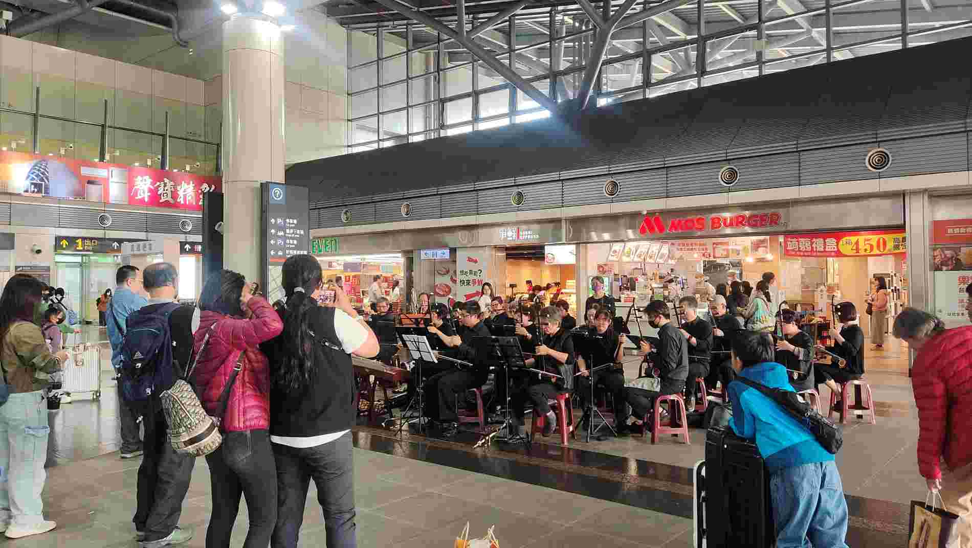 旅客融入氣氛中紅瓦厝國樂團由一群愛好國樂人士自主學習組成,結合歸仁在地的廟宇文化,經常在民俗活動中演出。20餘位團員分別以琵琶、古箏、二胡及中國笛等樂器,吹奏:花好月圓、丟丟銅都馬調、淚光閃閃等多首耳熟能詳的歌曲。團員們非常感謝高鐵台南站提供表演場地以及對藝文活動的支持。希望優美的國樂,能夠讓這個社會更添溫馨,讓人與人之間,更加關懷與體諒,共創美好世界!