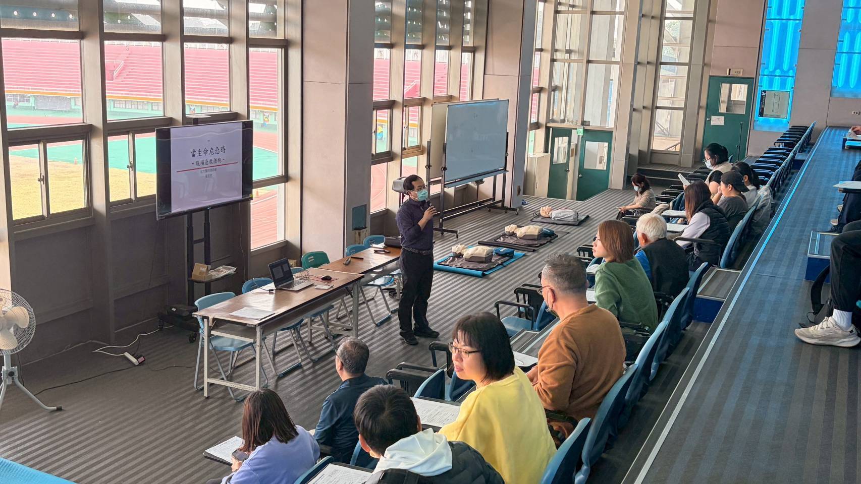 本次研習特別邀請成大醫院急診部張志然醫師擔任講師,課程內容涵蓋心肺復甦術(CPR)理論說明與自動體外心臟電擊去顫器(AED)實際操作,並透過情境演練加深本局所轄運動場館(含認養場地及委外場地)管理人員、相關廠商及承辦人員理解與操作熟練度,研習人員經測驗後皆取得CPR及AED 合格證照。