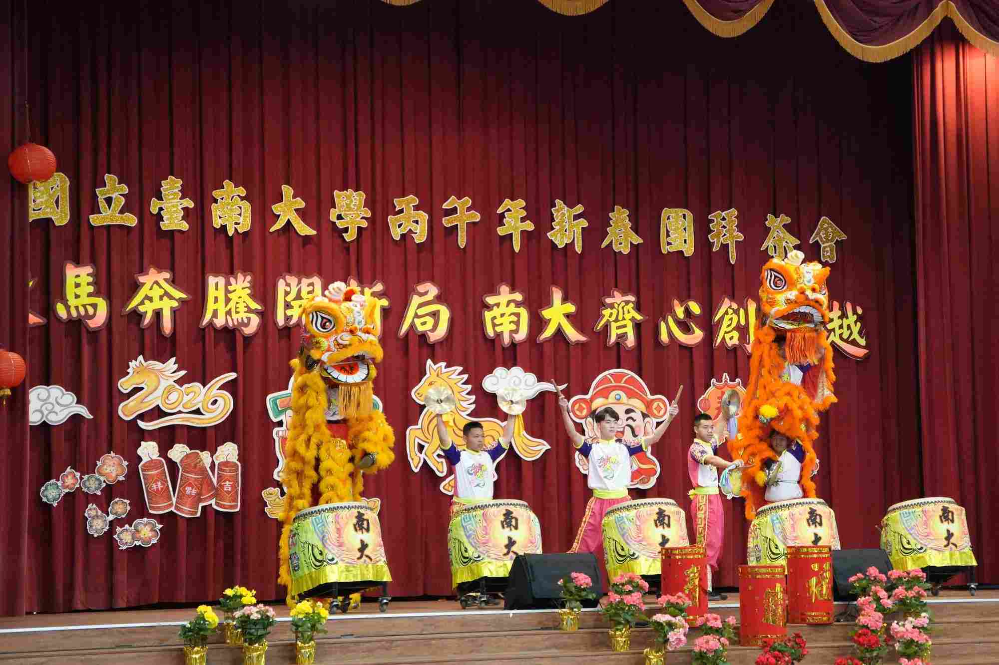活動由南大民俗隊「祥獅獻瑞」揭開序章,鑼鼓齊鳴、瑞獅翻騰,象徵吉祥開春;隨後親子團帶來「躍馬迎春・童心共舞」,以溫馨活潑的演出呈現家庭共融的畫面,讓現場洋溢笑聲與掌聲。人文學院舞蹈節目「天官賜福」以典雅細膩的身段傳遞迎春納福的寓意,壓軸由環生學院帶來「Omega 馬力全開」,節奏明快、動感十足,展現年輕世代的朝氣與創意,成功帶動全場氣氛。
