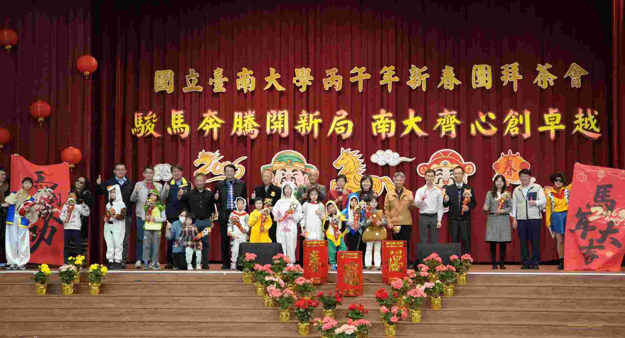 迎接嶄新的115年,國立臺南大學於2月11日上午在中山體育館舉辦「駿馬奔騰開新局 南大齊心創卓越」新春團拜活動。全校教職員工齊聚一堂,加上附屬學校的師長代表,以及多位返校與舊識重聚的退休師長同仁,大家在熱鬧喜氣的年節氛圍中互道祝福,為新的一年揭開序幕,也為校園注入滿滿能量。
