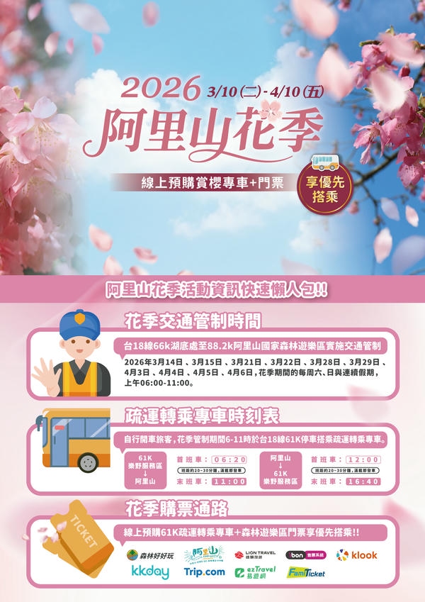 為提供更便捷的旅遊體驗,嘉義分署推薦出遊民眾優先選擇大眾運輸,選購「高鐵國旅聯票」除享有高鐵票價85折優惠外,更能輕鬆愜意的享受旅程,另呼籲自駕的遊客多加利用線上預購「疏運套票」(含疏運轉乘專車車票及遊樂區門票),以避開轉乘疏運專車之排隊人潮;今年線上購票通路更加多元,可透過「森林好好玩」、「阿里山Easy Go」、「雄獅旅遊」、「易遊網」、「KKday」、「Klook」、「Trip.com」、「7-11 ibon系統」、「全家FamiPort系統」等平台購買;花季交管、購票等詳細資訊請參閱。