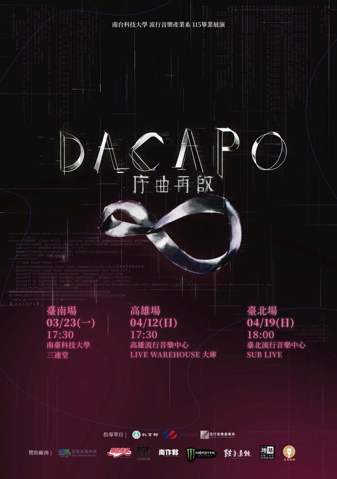 由南臺科技大學數位設計學院流行音樂產業系115級應屆畢業生所主辦之畢業巡迴演唱會《Da Capo(序曲再啟)》,預計於3月23日、4月12日及4月19日在南臺科技大學三連堂、高雄流行音樂中心與臺北流行音樂中心三地巡演,歡迎各界人士能夠蒞臨欣賞他們四年來的學習成果。