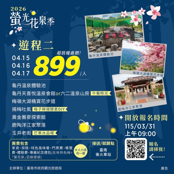 本次小旅行名額有限,超值優惠價每人只要899元,報名成功且完成報到者還可獲得活動限定「專屬紀念禮包」(螢花泉亞麻提袋+在地特色梅),歡迎民眾把握機會,與親友一同來場輕鬆愜意的春日小旅行,走訪楠西山林、賞花泡湯,享受春日悠閒與在地特色體驗。