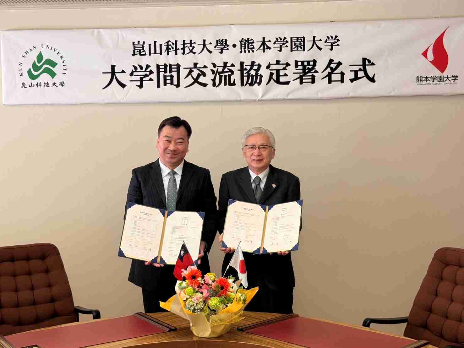 ▲ 崑山科大李天祥校長(左)與熊本學園大學林裕校長(右)簽署合作備忘錄