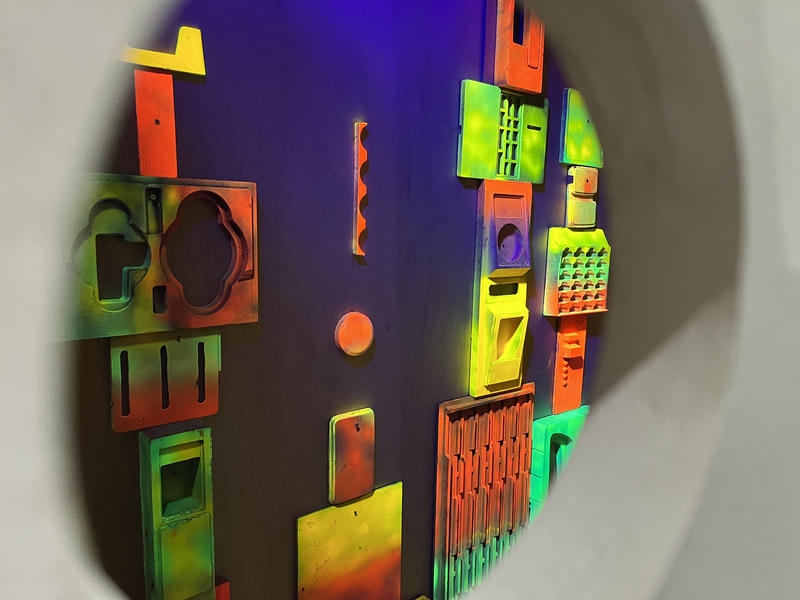 《展板內文明-萬花筒城市》於第二展覽室展出。藝術家林書楷從父親鑄造工廠接手木造模具,將這些充滿工業記憶的物件,重新建構成一座座未來城市的作品,觀眾可以透過展板上圓孔,看見這座城市不同角落的風景。另外,藝術家特別在探視的圓孔上安裝萬花筒,搭配燈光變化,帶給觀眾一種悠遊於現實與幻境當中的奇妙感受。