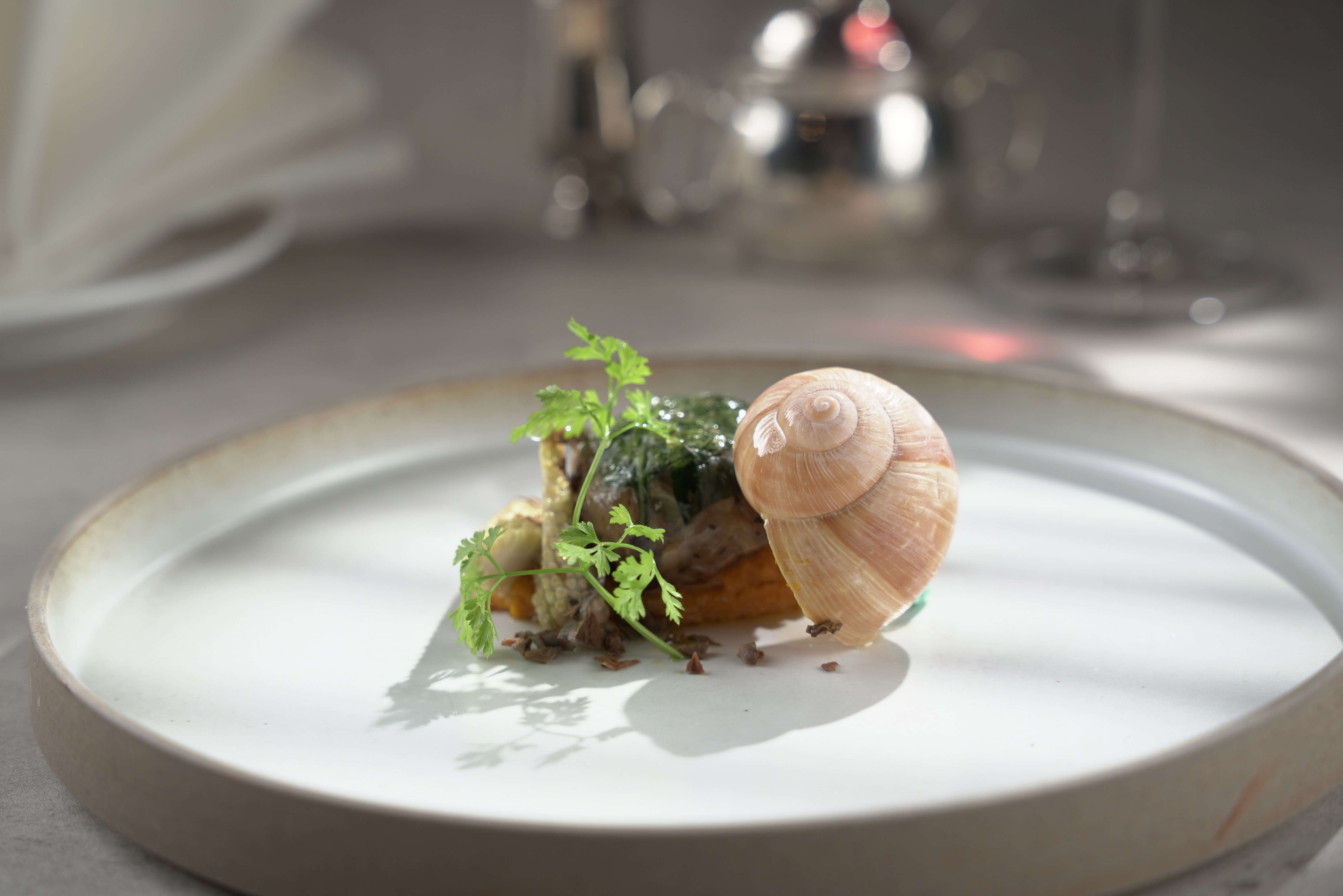 「三膳」指的是用餐三次,包括了下午茶、入住日晚餐與翌日豐富早午餐。晚餐採Tasting Menu,提供種類多份量精緻的料理,在精緻的份量中濃縮了主廚手藝。從「奶油麵包」揭開序幕,冷前菜巧妙運用蕨菜、野莧菜打成汁後與白花椰菜、風乾蕃茄一起享用,將原民採集文化細膩呈現。熱前菜則以野薑花清香揉合白蝸牛與南瓜的溫潤,展現山林間的野性美學,主廚以豬網油和九層塔油封白玉蝸牛,讓蝸牛有著濃郁的油脂香氣,但卻保留彈牙口感,除了搭配了野薑花末外,在南瓜泥旁還搭配醃製劍筍、山蘿蔔葉一起食用,每一口都嚐的到來自山林田野的驚喜。