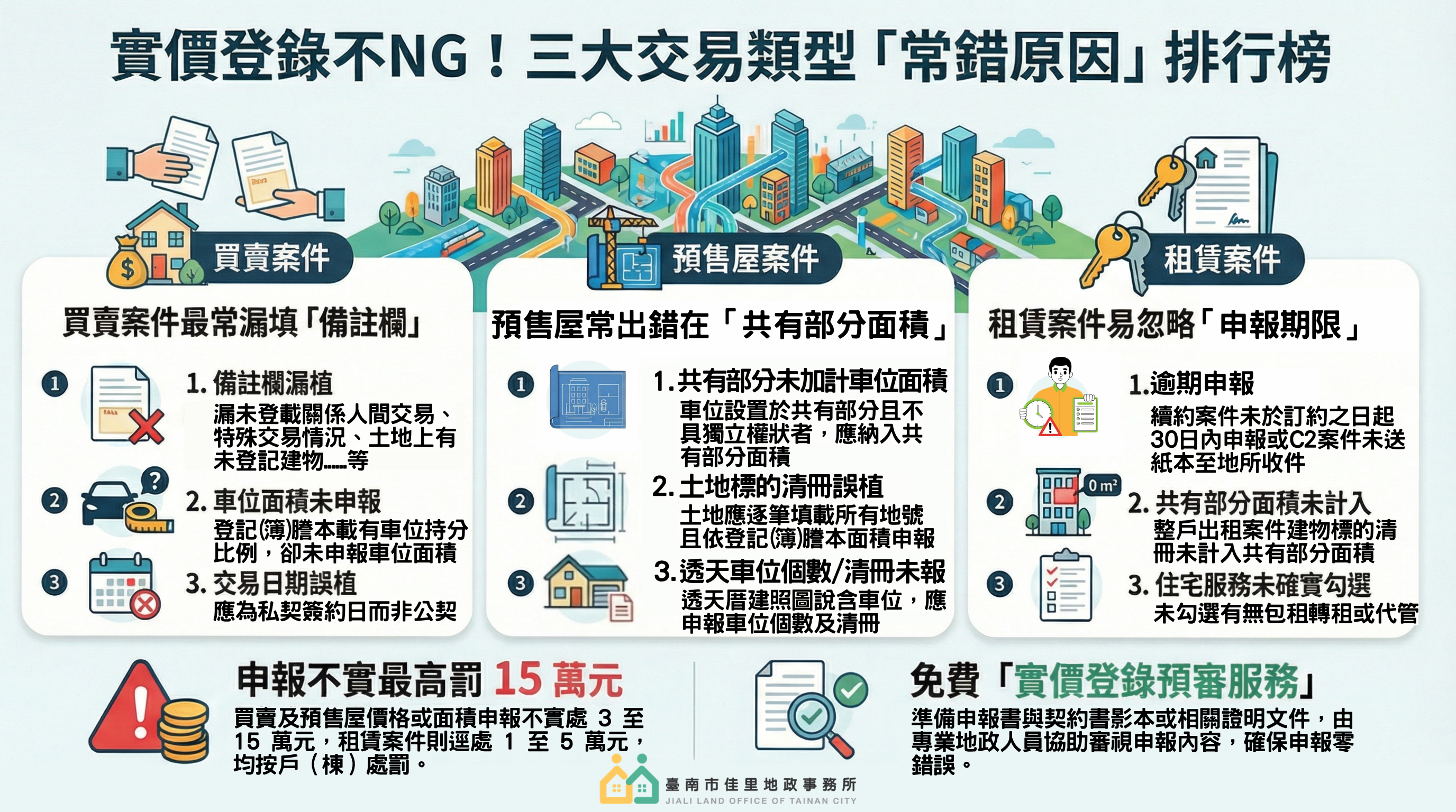 地政局提醒,實價登錄不僅是單純的紀錄,它直接關係到整個區域的市場判斷基礎,甚至影響政府未來制定相關政策的方向。然而,由於案件類型複雜,從買賣合約的備註欄位填寫,到預售屋共有部分的面積計算,許多錯誤往往源於民眾對法規細節的認知不足,或僅是單純的疏忽。