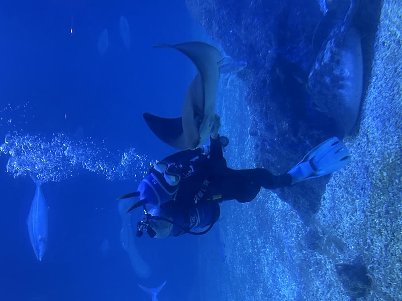 ▲ (圖)飼育員也特別戴上特殊頭套下水餵食,與民眾一起變裝同樂屏東海生館最萌搞怪盛事【萌鬼大鬧海生館:怪奇生物出沒!】於114年1