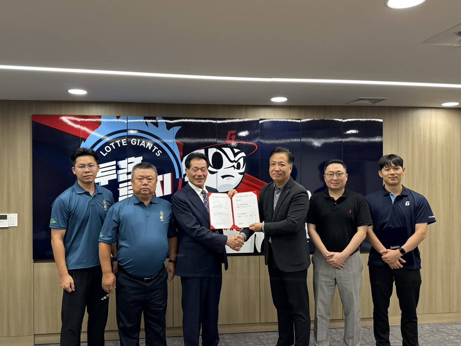 ▲陳良乾局長與南韓樂天簽訂合作契約大合影為深化臺韓國際體育交流並推動臺南棒球發展,臺南市政府體育局陳良乾局長9月12日拜會韓國職棒