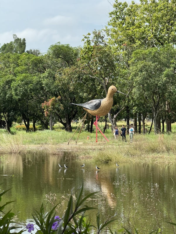 ▲ 作品與高蹺鴴的對話,展現自然生態的韌性與美麗 官田區是臺南埤塘與聚落優雅共存的一方淨土。大隆田生態文化園區前身
