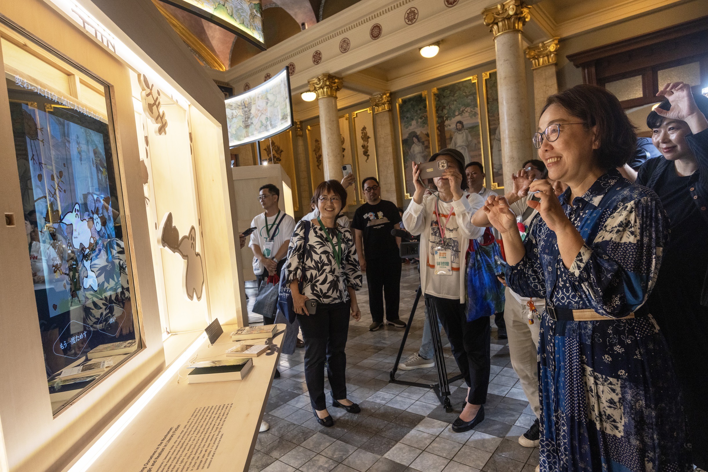 ▲ 「魔幻臺灣—臺灣文學展」即日起開展,文化部政務次長王時思(右2)、旅臺日本作家栖來光(右1)等人出席開幕式,並體驗互動式裝置,
