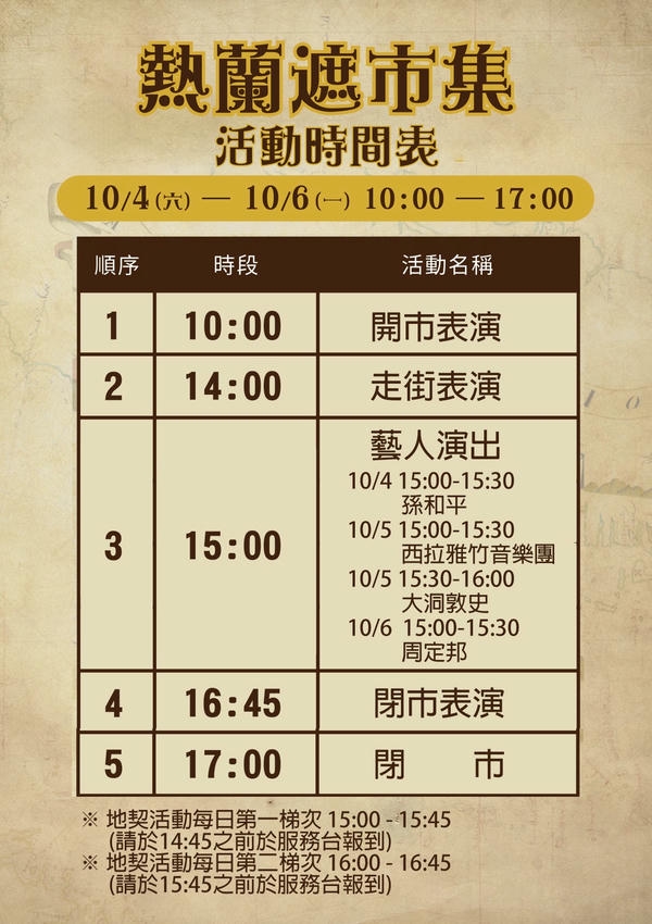 ▲ 1002每日行程表 臺南跨時空市集「熱蘭遮市集」將於中秋連假(10月4日至6日)在安平古堡登場,以17至19世紀的臺灣為