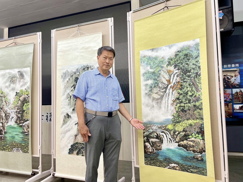 ▲ 廖仁彬與作品清流 市府秘書處為活化市政空間,即日起至9月29日邀請國內知水墨畫家廖仁彬師於民治中心一樓大廳辦理「大地的山