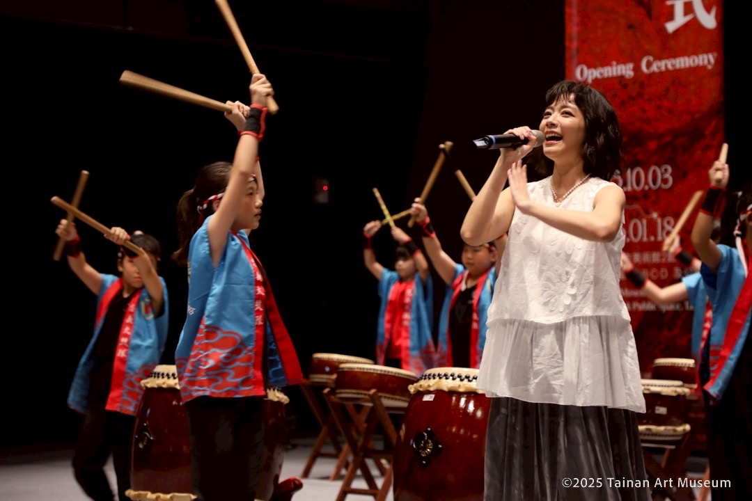 ▲ 臺南市美術館今舉辦「皮膚と內臓-自己、世界、時間」展開幕式,邀請知名實力派歌手林雨宣以及忠義國小太鼓隊進行開場表演,更一同演繹