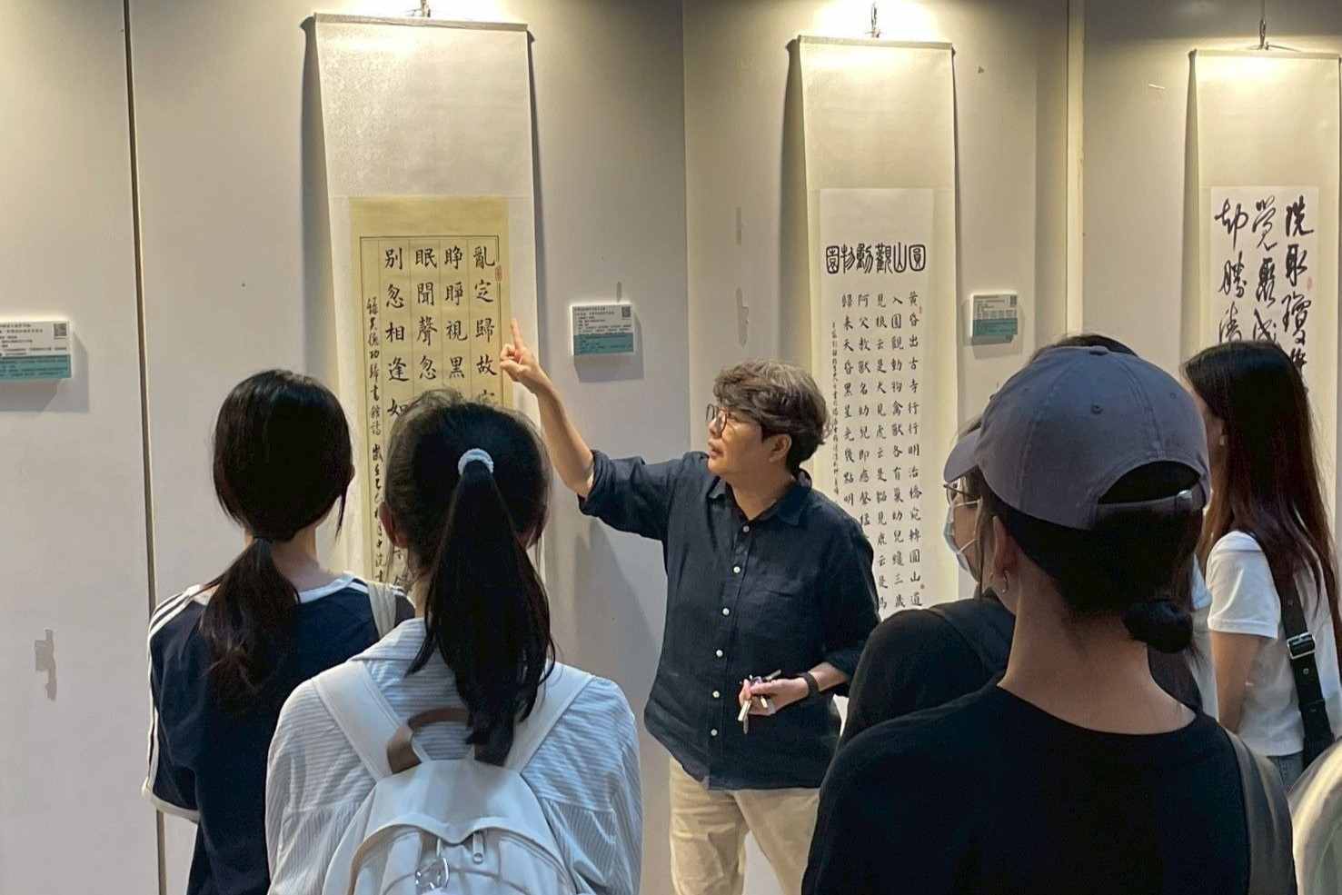 ▲ 策展人南大莊千慧副教授導覽現場,引領觀眾深入理解詩作意涵國立臺南大學文薈樓自9月新學期開始展出「心托毫端─臺灣漢詩微型書法展」