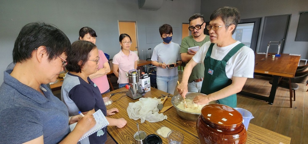 ▲ 擅長阿美族製麴和釀造工法的丮硠‧瑪那(著圍裙者)。(丮硠‧瑪那提供) 臺南市政府觀光旅遊局邀請作家張耘書及鄭佩雯採集各