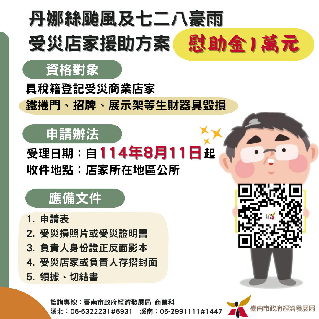▲ 臺南店家生財器具災損援助方案圖卡臺灣近期受到自然災害衝擊,臺南市列為重災區,先有丹娜絲颱風挾帶強風豪雨侵襲,隨後又在7月28日