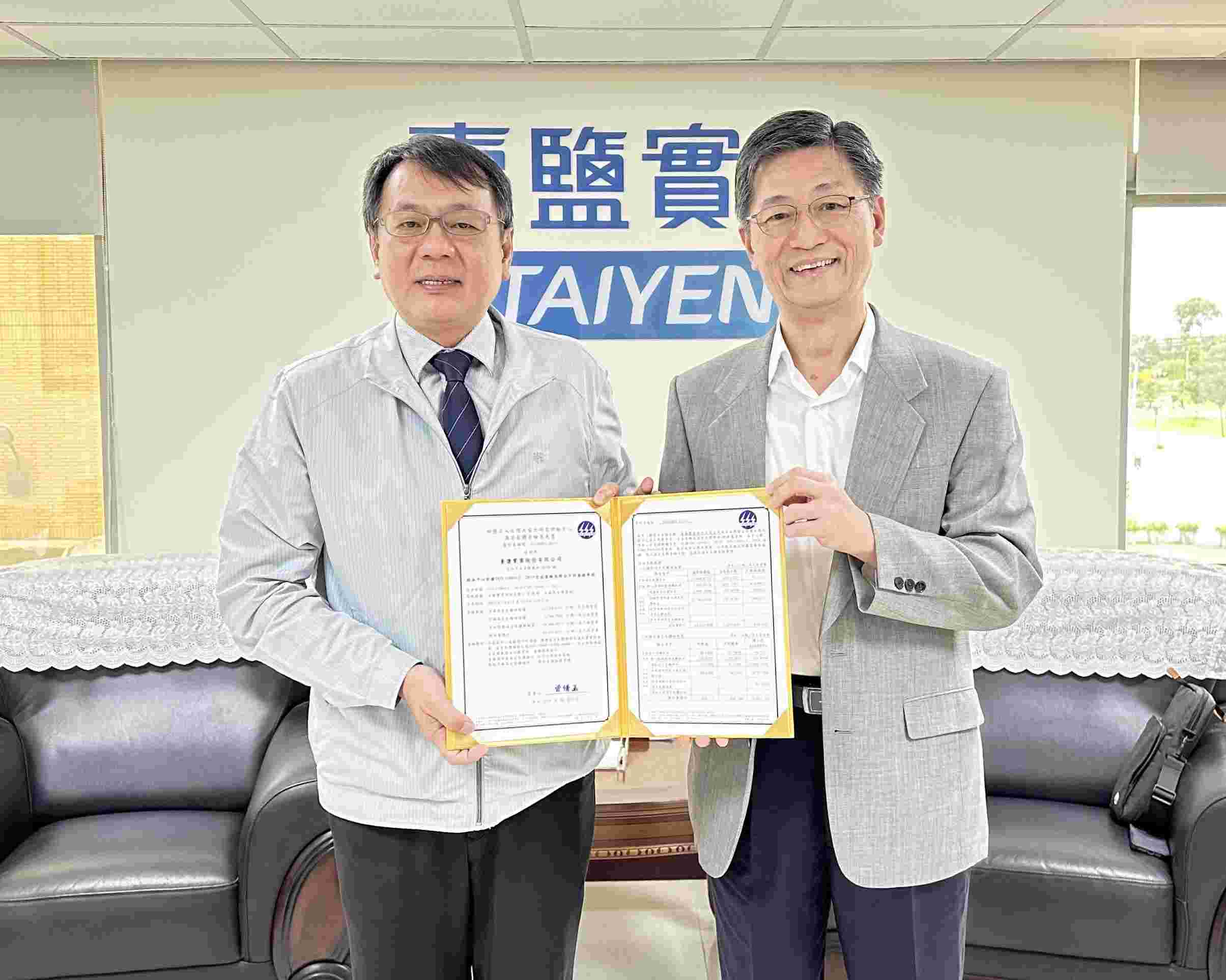 ▲ 臺鹽公司通過ISO 14064-1溫室氣體盤查查驗,由財團法人台灣大電力研究試驗中心董事長簡福添(右)頒發證書予臺鹽董事長丁彥