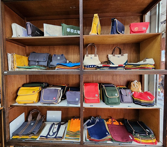 ▲ 合成帆布行店內有各式帆布包款,以質樸手感受到消費者喜愛。(鄭佩雯拍攝) 臺南市觀旅局今(2025)年「臺南奇人帶路」系列