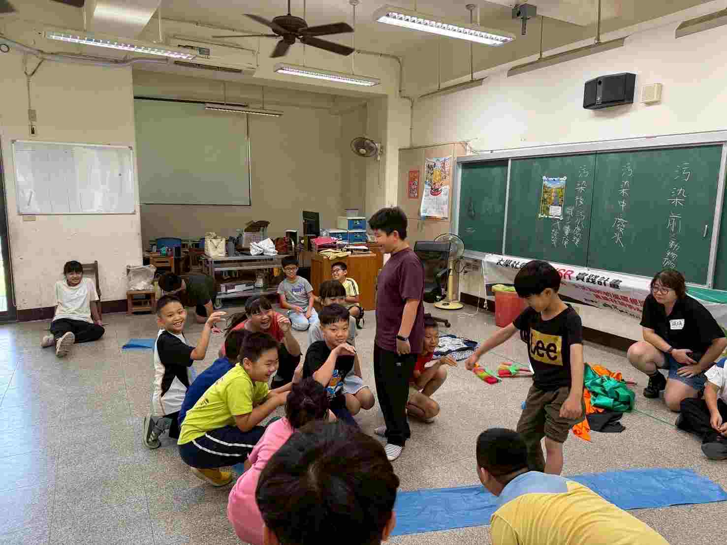 ▲ 孩童進行角色扮演,加深對水污染議題的理解與反思崑山科技大學USR深耕型計畫「以技術為體、生活為用的循環經濟路徑—建構社區的永續韌性」,