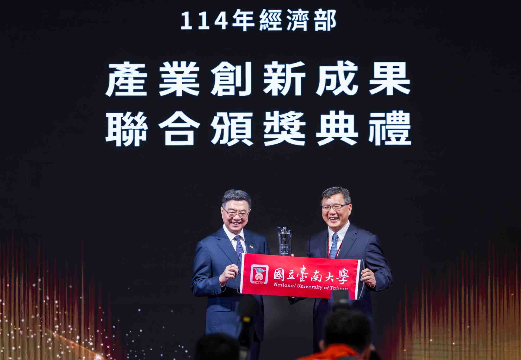 ▲ 南大環生學院傅耀賢院長從行政院卓榮泰院長手中接下經濟部第9屆「國家產業創新獎-產學貢獻組」獎項國立臺南大學環境與生態學院傅耀賢院長深耕太