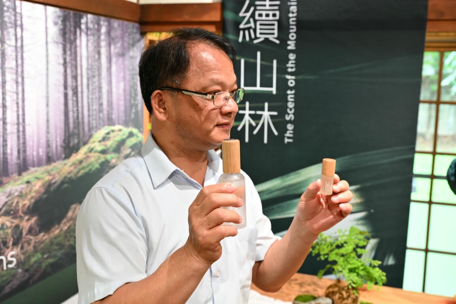 ▲ 嘉義分署分署長李定忠手持新品精油及香氛,說明林業剩餘資材經過循環利