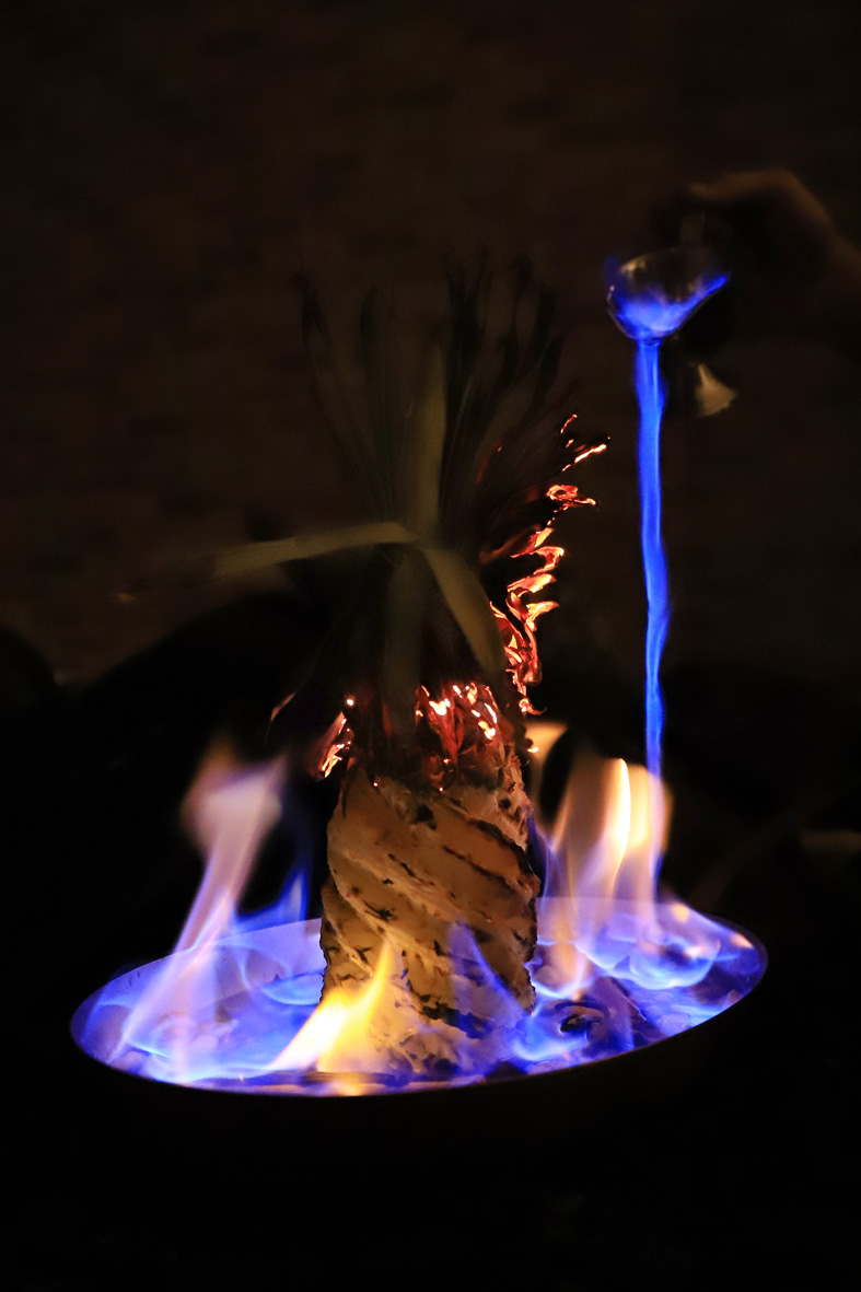 接著將進入此次客座饗宴的重頭戲蘭姆巴巴,全場視覺焦點轉移到Nick手中的那團蘭姆酒火焰,豪氣地澆淋才發現原來是顆「浴火鳳梨」。以傳統法式「巴巴」為基底,主體蓬鬆的海綿蛋糕,搭佐甜醬是用鳳梨丁、肉桂與八角等香料糖炒入蜜,品嚐前淋上即時炙燒過的蘭姆酒,在既有的甜味中揉合了酒、果、糖的獨特香氣,結束前再搭配法式小點:海鹽焦糖棒棒糖、竹炭馬卡龍、威士忌巧克力為饗宴劃下創意無限的完美句點。