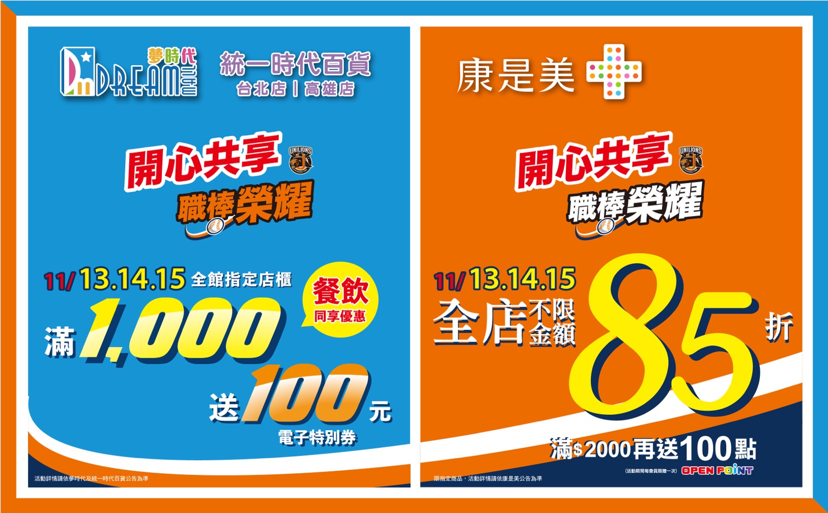 康是美推出全店消費不限金額享85折,消費滿2,000再送OPEN POINT 100點,購買統一集團品牌指定商品再享OPEN POINT點數12%回饋;統一時代百貨台北店與高雄店、高雄夢時代,更推出超低門檻,全館指定櫃位消費滿1000元即送100元電子特別券,活動並首度納入『餐飲』櫃位,同享優惠。歡迎大家一同輕鬆享用美食,開心共享職棒榮耀!