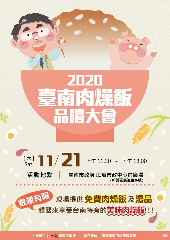 農業局表示,為了推廣國人愛用國產豬肉,搭配台南優質好米,「2020台南肉燥飯節」爭霸賽本週六(11/21)上午8時到下午2時,在民治市政中心前廣場開戰,邀請餐旅學校、農會等民間高手,還有在地肉燥飯商家,作夥來PK一較高下。爭霸賽分為名店組及創意組,名店組將選出最佳口味獎、最佳廚藝獎、最佳人氣獎、最佳活力獎、最佳優選獎;創意組則選出金、銀、銅牌及優選。11:30~13:00還有肉燥飯品嚐會,總計60攤、共計6,000碗肉燥飯,邀請民眾一起來品嚐鑑賞。
