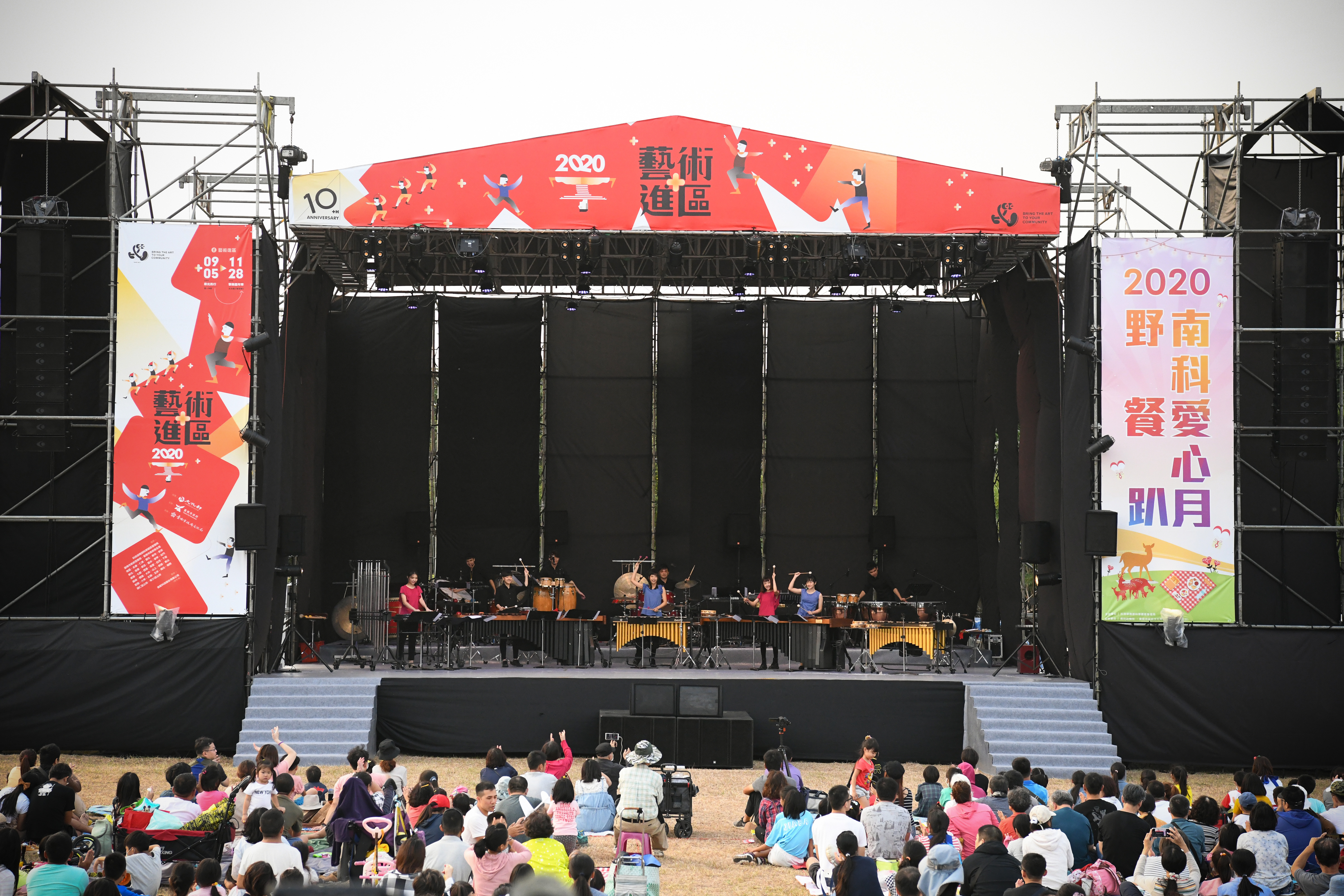 2020藝術進區活動進入最終回,本週11月28日(六)16:00由朱宗慶打擊樂團2於新市區南科園區迎曦湖南側草坪,帶來閉幕場壓軸演出《擊樂嘉年華》,吸引超過四千民眾到場,為2020藝術進區系列活動畫下完美的句點。