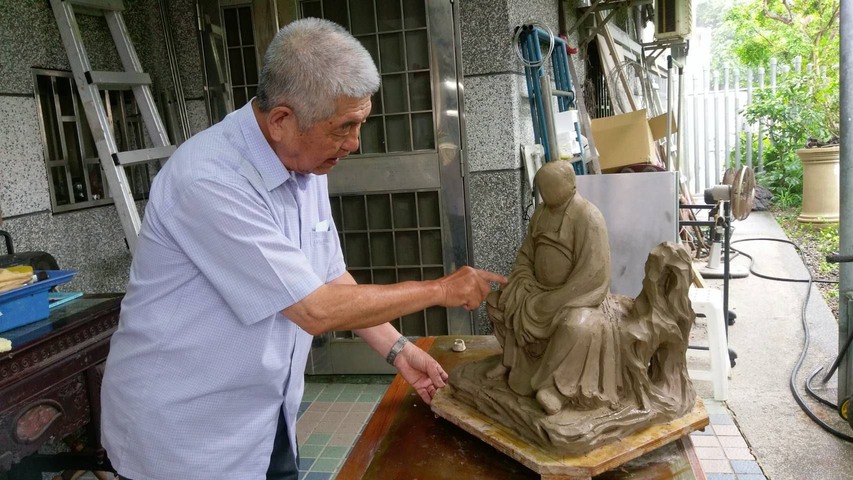 「剪黏」陳三火藝師,師承洪坤福派下,修建過一百多間廟宇,被譽為「屋頂上的藝術家」。在材料上,從前期廢棄瓷片、杯碗,至中期的彩色玻璃,到晚近淋搪的使用,深刻反映了臺灣各時代的價值觀、工藝演進的歷程;在製作方式上,則將剪黏轉向立體化、巨型化,呈現動態美感,刻劃細膩,色彩華麗,具個人風格。