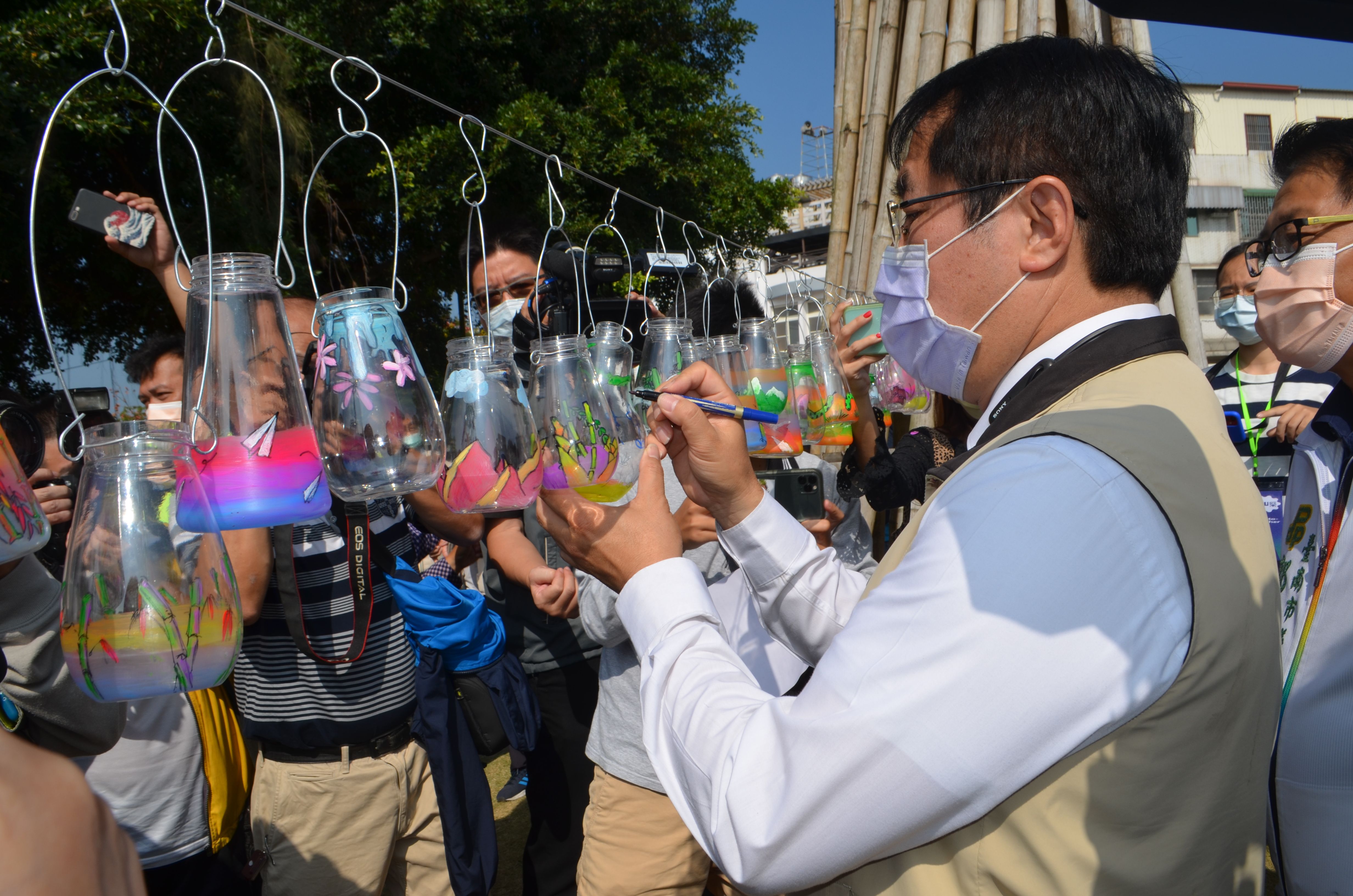 ▲ 黃偉哲市長坐在大型竹編上行銷空山祭活動