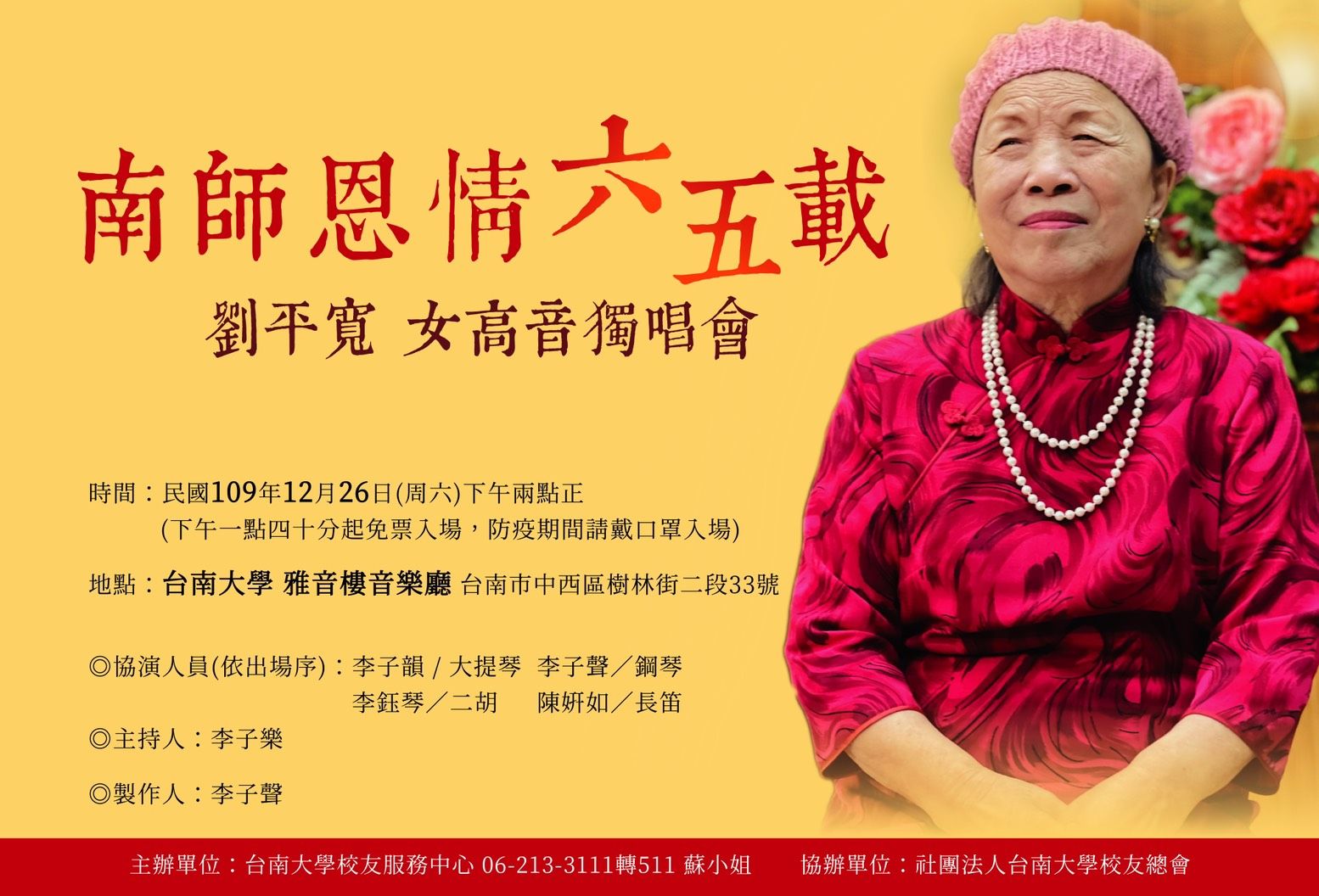 劉校友演唱會曲目國立臺南大學44級校友為慶祝畢業65週年,於12月26日(星期六)返校舉辦級友聯誼會,其中已高齡88歲的劉平寬校友,為感念母校培育之恩,於當日下午2時在南大雅音樓音樂廳舉行中文藝術歌曲演唱會,歡迎社會各界蒞臨聆賞。