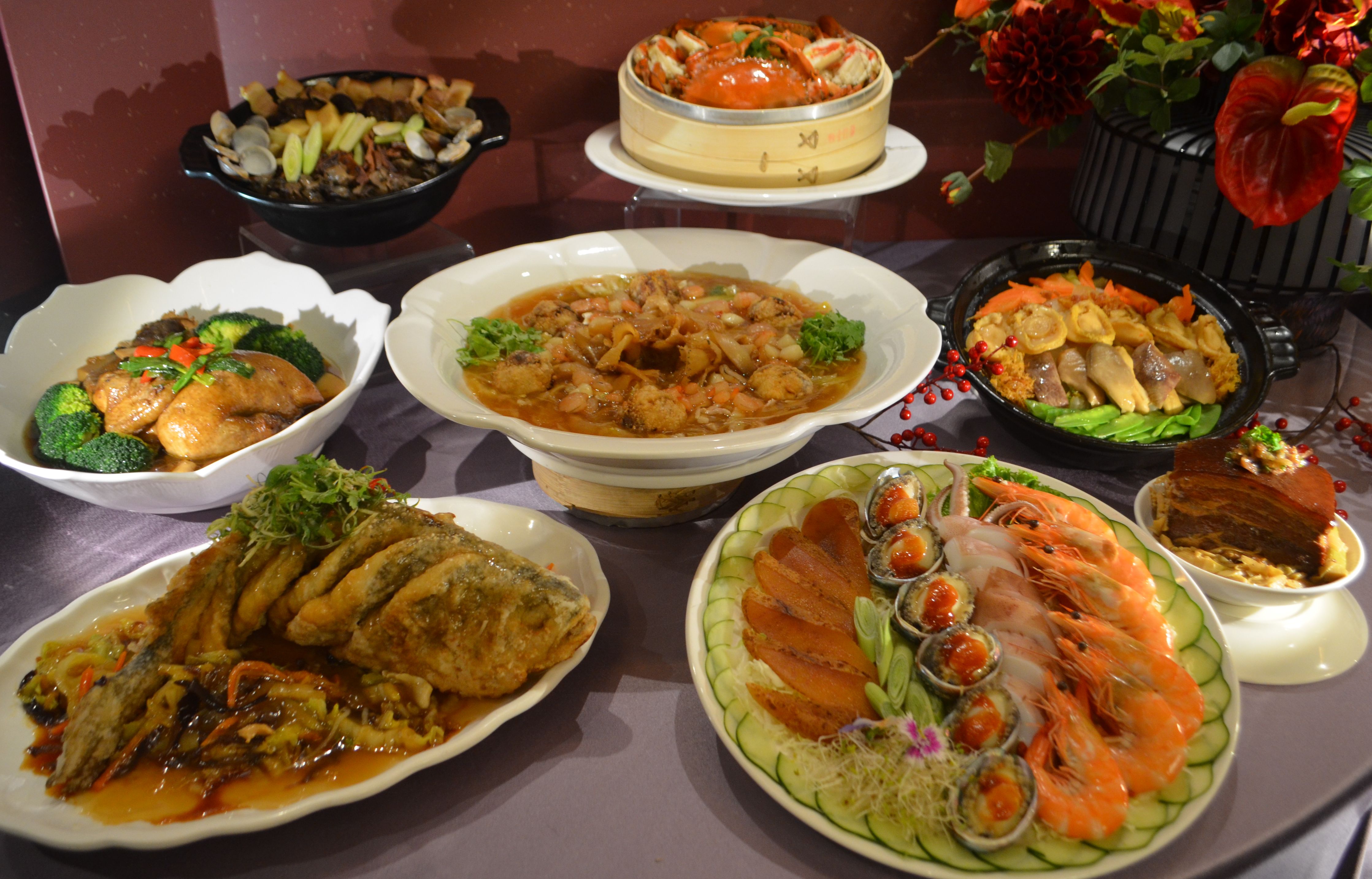 、彈牙入味的九孔、鹹香古法筍絲控肉、吮指醉蝦、鮮美冰卷,豐富又開胃;「台式八寶魚翅羹」濃郁的羹湯口味微酸帶甜,搭配手工八寶丸、筍絲、香菇絲、白菜、蝦仁等等,融入完美的古早風味;「五柳枝海上鮮」黃魚下鍋炸至酥香,淋上台南道地五柳枝烹調方式,入口鮮嫩;「霸王蟳慶豐收米糕」肉質爽口的雙紅蟳,搭配開陽、魷魚條、香菇絲、紅蔥與糯米拌炒,是道甜鹹綿密的特製油飯;「南靖封土雞」追溯歷史超過300年的傳統台菜,得經過醃、炸、滷、泡、燴、蒸等程序,是繁複、費時的暖心佳餚;「鮑魚豬肚白菜滷」採用山東大白菜及上選澳洲深海鮑魚及豬肚細細慢滷出鮮甜彈牙好滋味,白菜綿密入口即化,呈現元氣滿滿的古早台菜風味。湯品則推出特選老母雞搭配珍貴花膠及多種山珍海味的「台式佛跳牆」及堪稱最具台灣古早味代表的「魷魚螺肉蒜」;2款湯品可選擇1款作為外帶套組搭配。